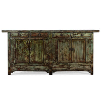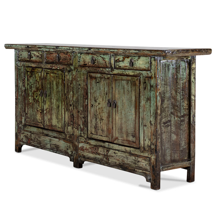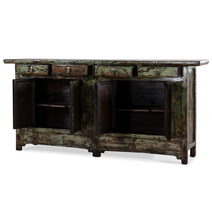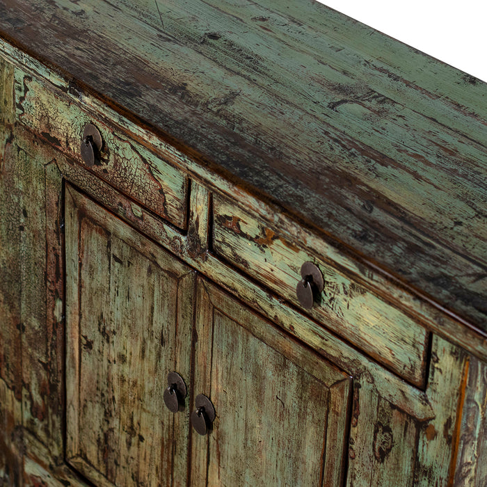 At over two metres wide this stunning sideboard would provide ample storage space as a dining room buffet or for living room storage. It has been restored and refinished in a stunning, distressed green, sealed with a shiny varnish. The lacquer has been applied so as to retain some of the character of the original piece, with crackled effect in some sections and the worn, natural wood colour showing through in others. The sideboard has been fitted with two removable shelves inside and there are four shallow drawers above the doors. A unique accent piece that would make a statement in any space.