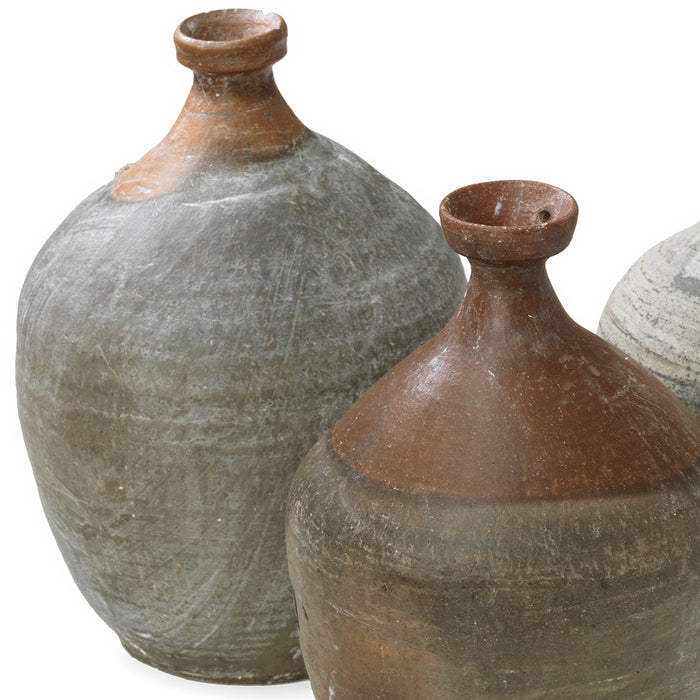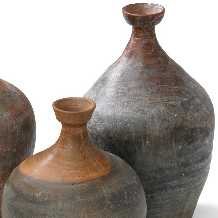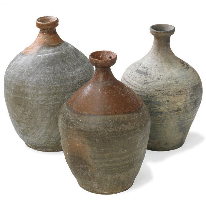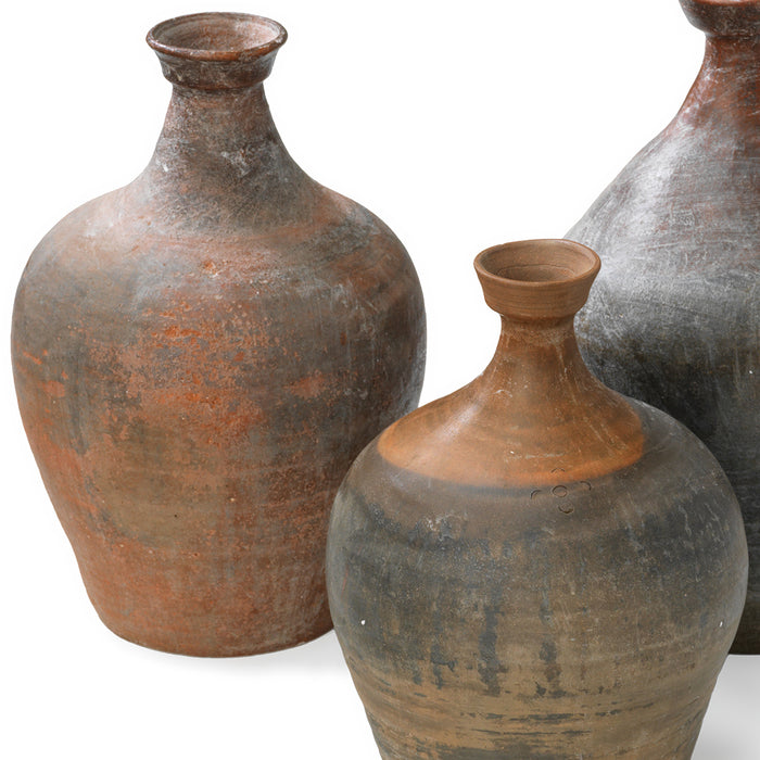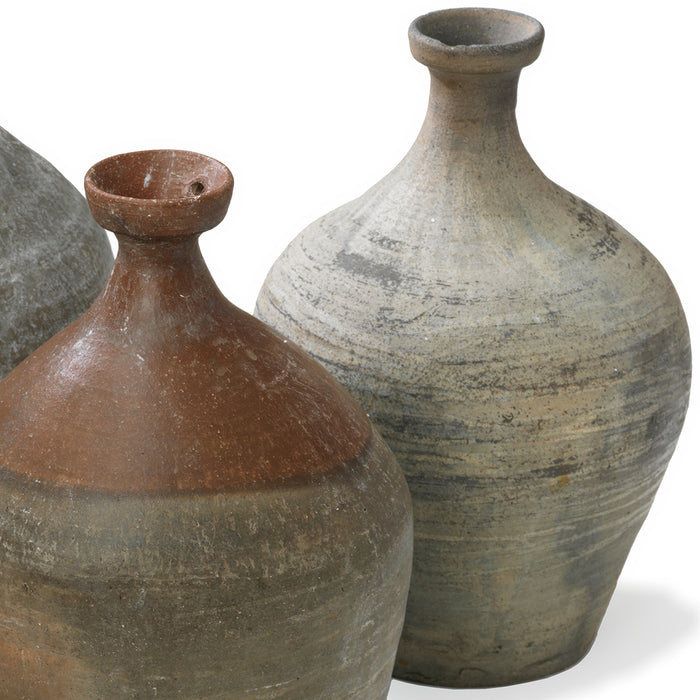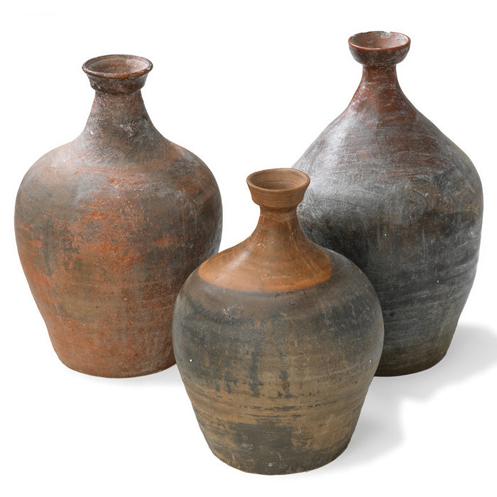 These vintage earthenware jars were traditionally used to contain oils, wines or other liqueds in northern China in the mid-1900s. Each bottle possesses a slender neck and unique dimensions and patterns, with some featuring a dual-coloured mix of shades of brown and grey. They make for refined floral vases, functional containers, or just intriguing decorative objects.