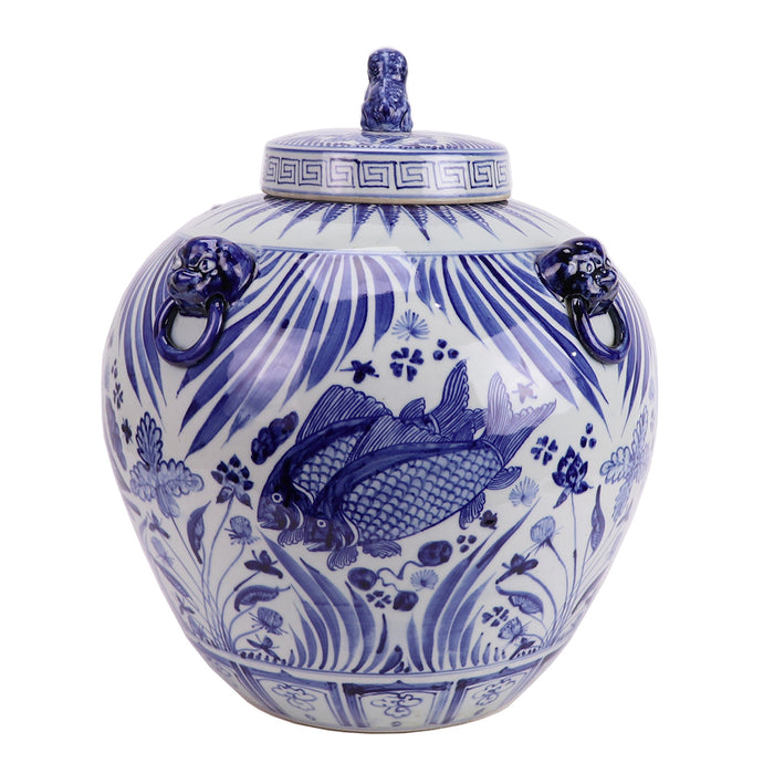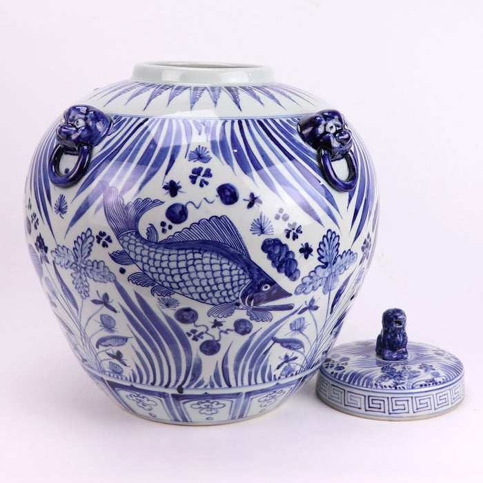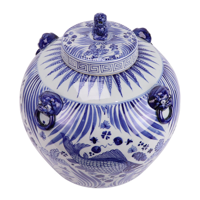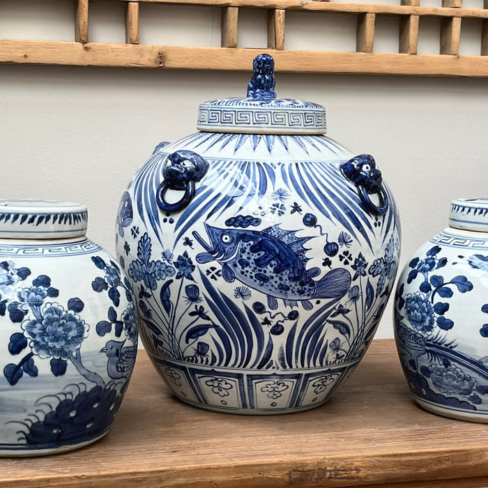 These beautiful, large lidded jars are decorated with fish as a symbol for prosperity. The jars include four lion head handles and a temple lion - seen as a protective guardian in China - forms the handle of the lid. The jars are produced by hand in Jingdezhen, the historic centre of porcelain in China and still renowned today for the quality of its wares. The colours are acheived using a classic cobalt pigment fired with a clear glaze, creating the wonderful, deep blue against the white background.