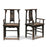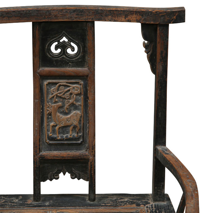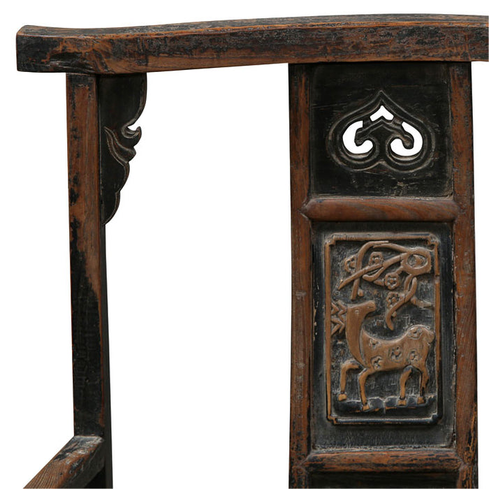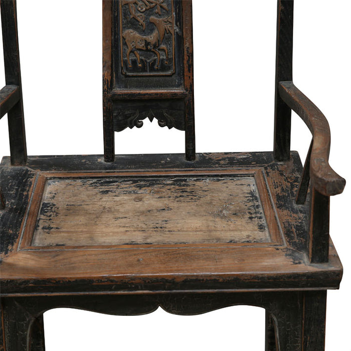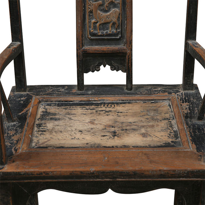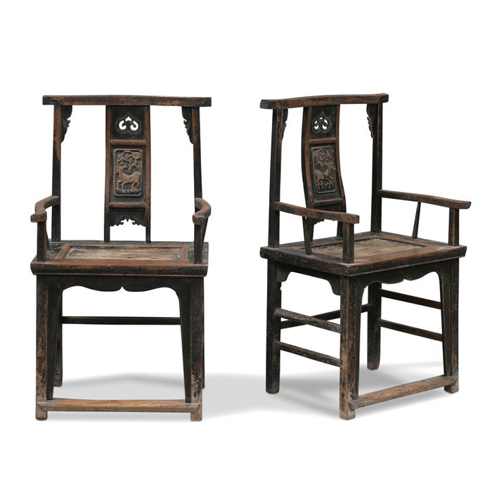 This beautiful pair of chairs are in elm wood and come from Shanxi in central China. They are based on a style known as 'official's hat' or 'yoke-back', but in this case the extending top rail that gives the style its name is only slightly curved. Unusually, the rail, legs and supporting posts are all squared rather than rounded. As is typical on Chinese chairs the backrest has some lovely carved decoration. In this case there is an auspicious 'ruyi' symbol in open carving on each chair above a Chinese unicorn ('kylin') in relief. Originally in a deep black lacquer, the finish has largely worn on the seat, armrests and footrests to show the paler wood underneath. A beautiful, quite unusual example of Chinese armchairs that would look fantastic in a modern setting. Sold as a pair, the price shown is for both chairs.
