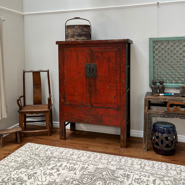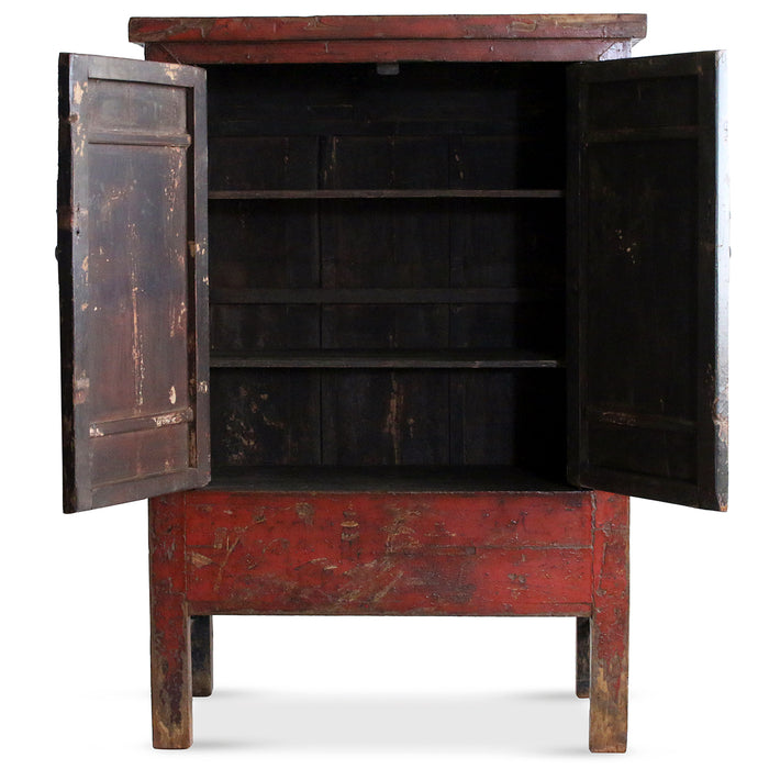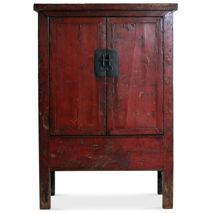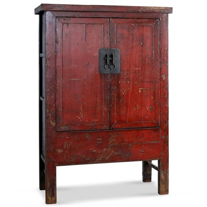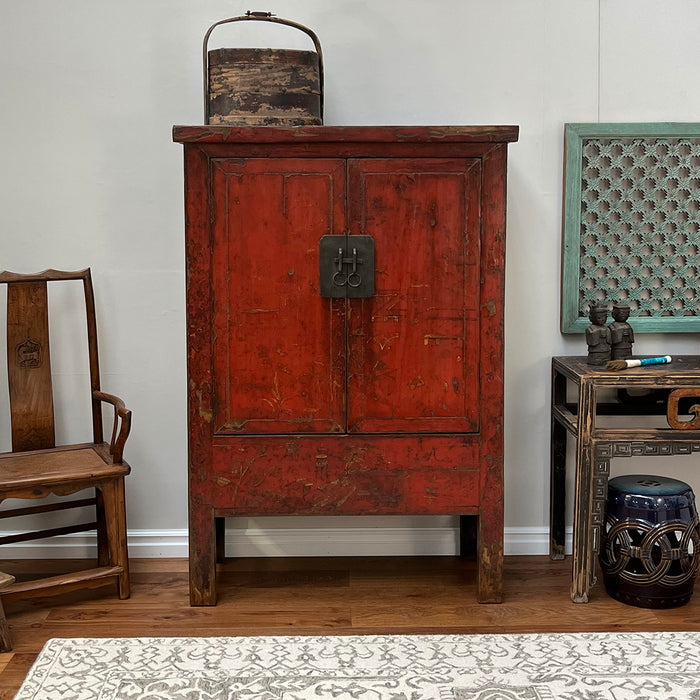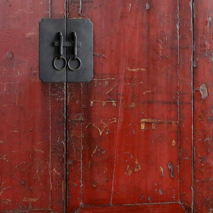 Other than the square hardware on the doors, which is a more recent replacment, this beautiful cabinet is in its original condition, with the old red lacquer finish and gold decoration. The cabinet would have been produced as part of a wedding dowry, presented to the couple by the bride's parents along with its contents. Red and gold are considered lucky colours in China and so it was common for wedding cabinets to be finished in this way.