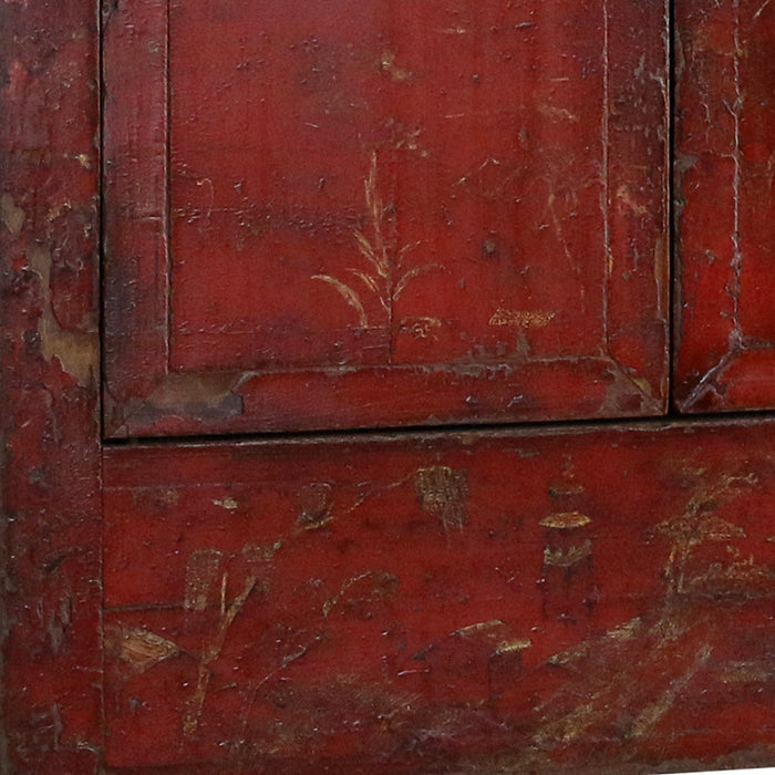 The gold leaf was applied over a darker painted base to decorate the lacquered cabinets using a technique known as 'miao jin'. Over time the gold tended to wear away and so in most cases cabinets like this have been retouched or completely repainted over the years. Here the paintings are original and, though worn, it is still possible to make out details of the landscape scenes on the doors and lower panel. The red lacquer itself has also worn in parts, particularly around the feet and on the top frame, giving a unique patina and character to this wonderful piece.