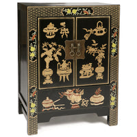 The painted designs in gold on the doors and bottom frame show vases, bronzes and other valuable possessions typical of an ancient Chinese household - a common theme on cabinets throughout China.