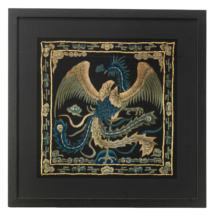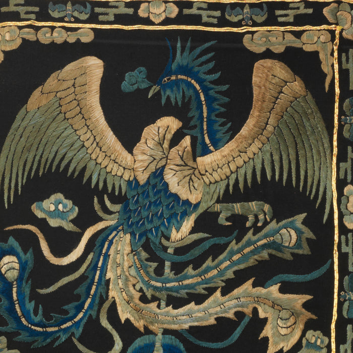 This unusual embroidery is a replica of the embroidered badges used to embellish the garments of Chinese officials and their spouses. It is hand-stitched using high-quality silk and is sold mounted and framed as shown. The intricate design features a phoenix in silver and blue, which is a traditional symbol for peace and prosperity in Chinese culture and used to symbolize the empress, representing beauty and grace.