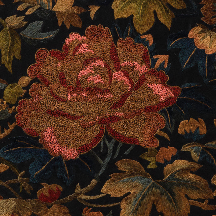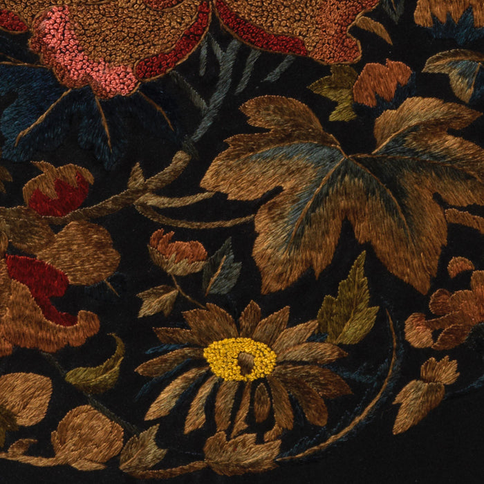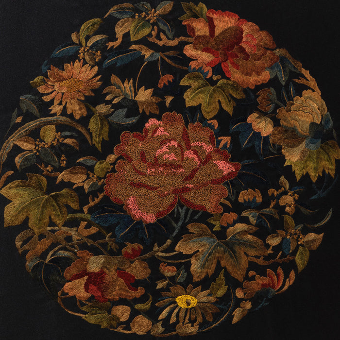 This delicate, beautifully crafted embroidery shows a large, pink peony flower flanked with various other colourful flowers and leaves. It is a reproduction based on traditional Chinese designs used to decorate pillowcases or curtain fabrics. The peony is a common symbol in China, representing nobility and high rank. Supplied mounted and framed as shown.