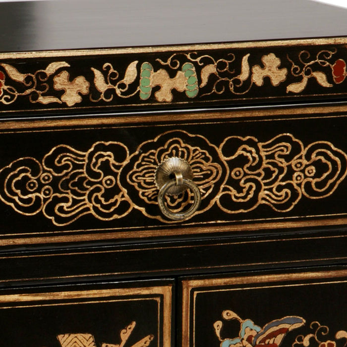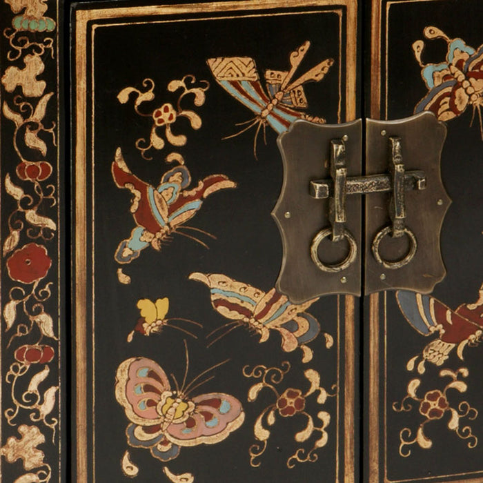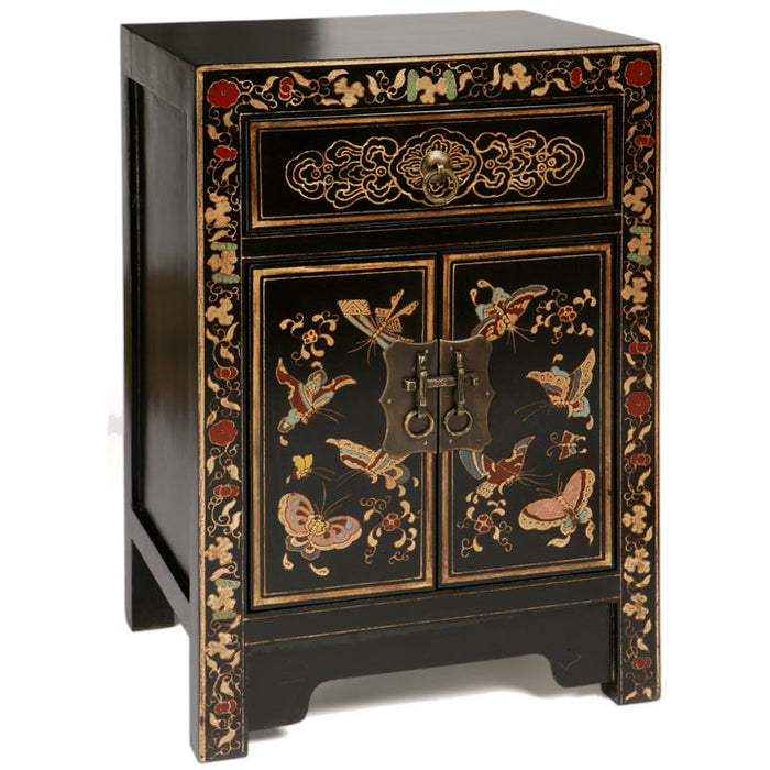 Finished here in black lacquer, these pretty little bedside cabinets are decorated with gold leaf and painted by hand. The colourful butterflies on the doors are framed on the outside with flowers in gold, red and green. The butterfly is a symbol of happiness in a marriage for the Chinese and as such is often seen on painted Chinese cabinets and chests that were made to be given as part of a wedding settlement. These ones are beautifully made with traditional wooden peg hinges and a single drawer at the top. Also available in red lacquer or cream lacquer. Other colours can be made to order.