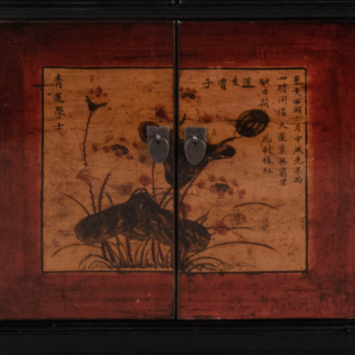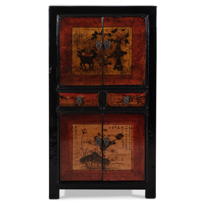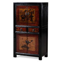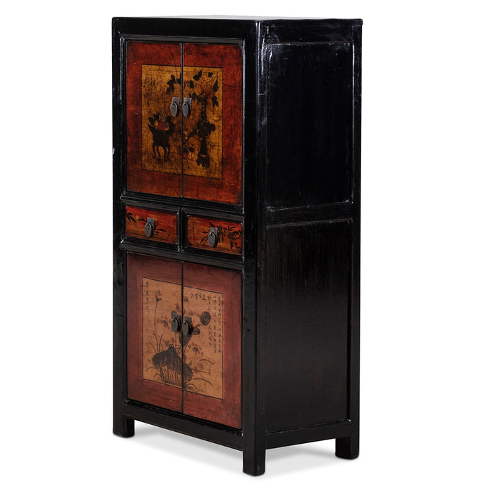 This elegant cabinet features two painted doors and two drawers, adorned with flower vases and curios in a traditional Gansu province style. The artwork is set against sepia tones and framed in red, creating a beautiful contrast with the black lacquer panels. Made from reclaimed pine wood, the cabinet follows the classic frame and panel design commonly used in Chinese furniture for centuries. Its tall, narrow structure provides ample storage space in both the upper and lower compartments, making it a versatile addition to any room.
