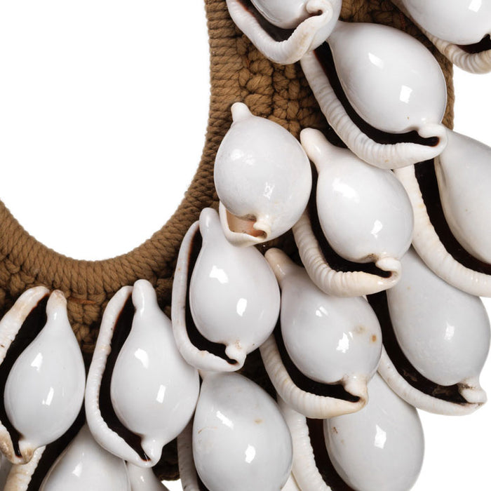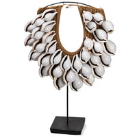 These three layer necklaces are made from braided rope and large cream cowrie shells, each layer slightly increasing in size. They are supplied with a metal stand as shown and make beautiful decorative objects. Please note that, as they are made by hand, each necklace is unique and so may differ slightly from the examples shown.
