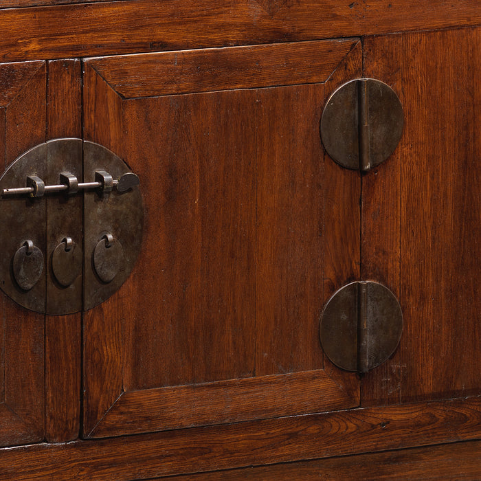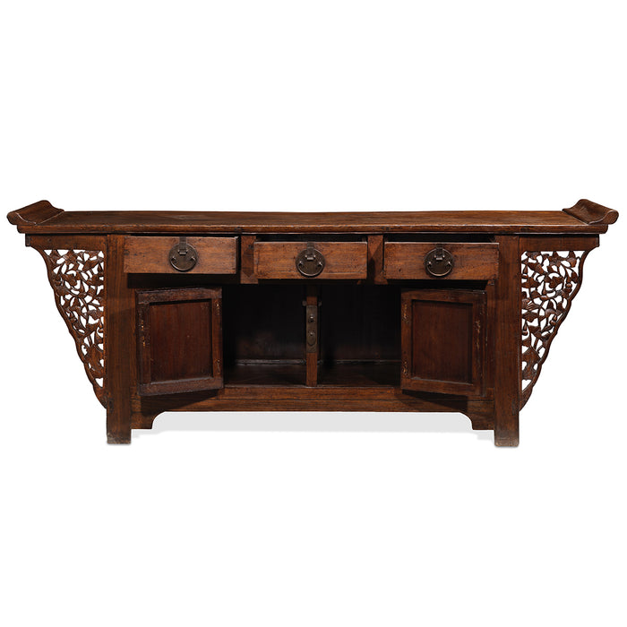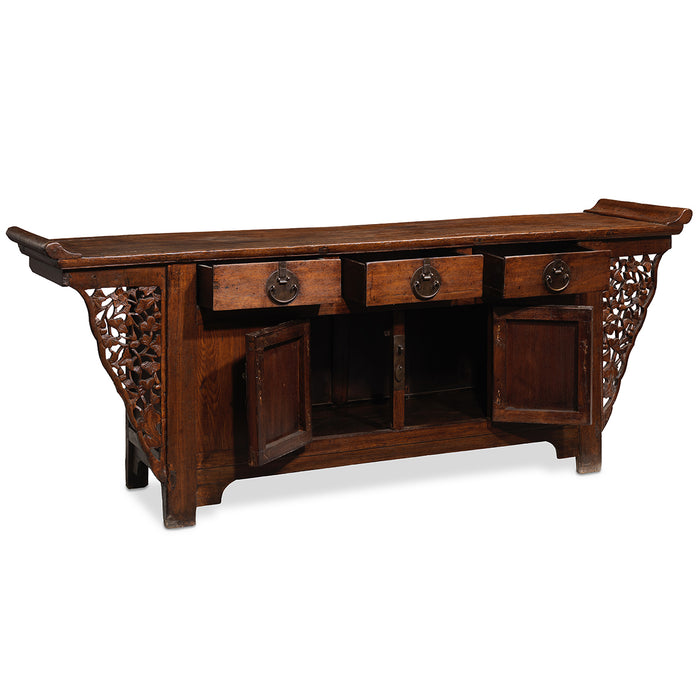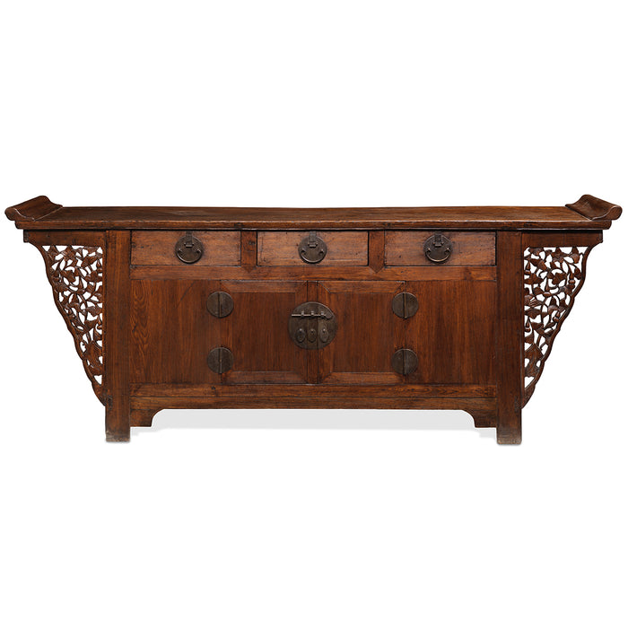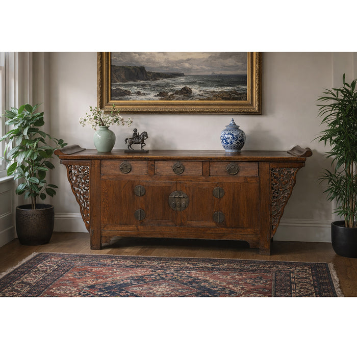 This large, elegant sideboard originates from Beijing and dates to the late nineteenth century. Crafted from richly toned elm wood, it displays the refined proportions and decorative confidence associated with furniture made for wealthy households during the late Qing dynasty.