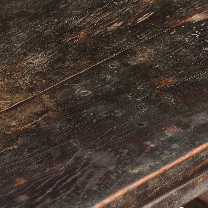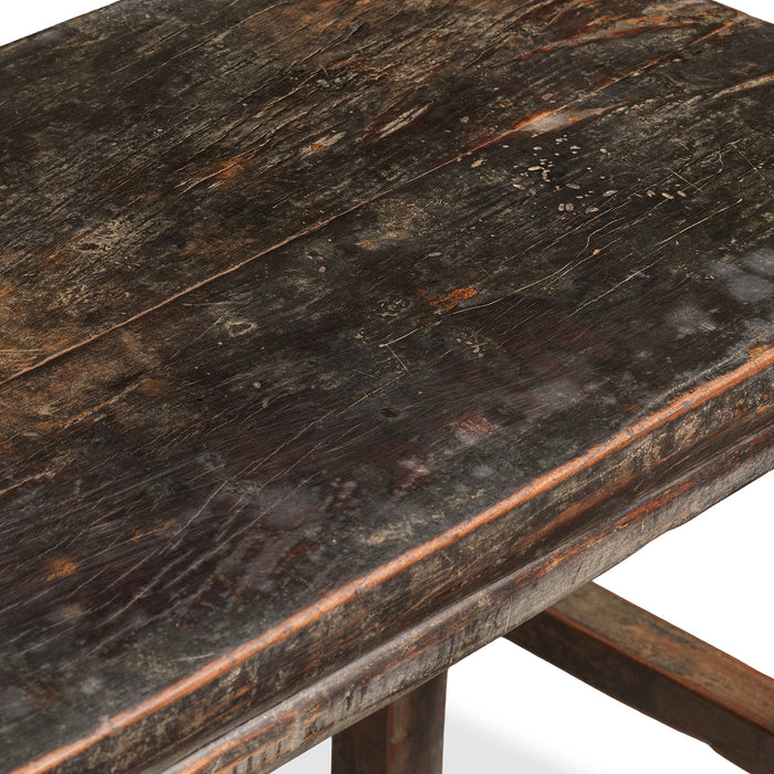 The surface shows a beautifully aged patina, with softened edges, subtle undulations, and visible grain that speak to decades of daily use. Marks, colour variations, and gentle wear across the top add depth and authenticity, giving the table a warm, timeworn character. The understated construction is complemented by simple stretchers that run between the legs, providing stability while maintaining a light, open feel.