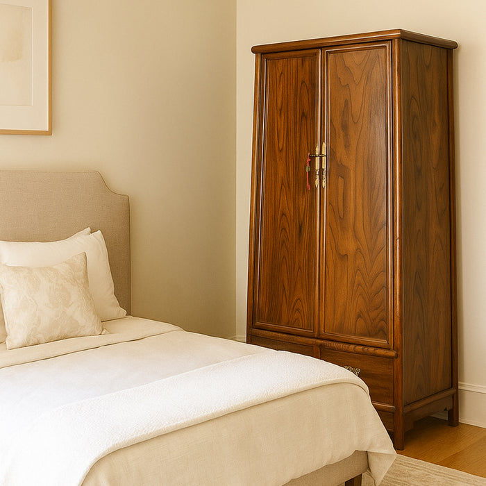 Ce type d'armoire était courant dans toute la Chine, où de grandes versions comme celle-ci étaient utilisées pour ranger des vêtements et d'autres objets. Les originaux ne comprenaient que des étagères, car les Chinois pliaient leurs vêtements lorsqu'ils étaient rangés, mais le nôtre comprend une tringle à suspendre en bois ainsi que trois étagères amovibles. Il fonctionne donc parfaitement comme une armoire élégante et moderne ou comme une unité de rangement plus générale. Deux tiroirs inférieurs offrent un espace de rangement supplémentaire utile, chacun étant doté d'une poignée en laiton avec une épingle et un pompon décoratifs.