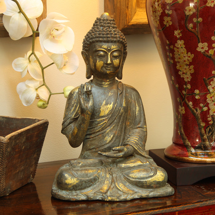 The Buddha is shown here with the right hand raised and facing outwards, representing protection and the overcoming of fear and anger. The figure is a replica made in cast bronze and a with a worn appearance accented with gold hints for an aged look. Note that, as every statue is hand-crafted, the final finish may have minor variations compared to the example shown.