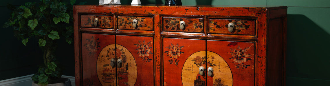 Finies ici dans une riche laque rouge, ces superbes armoires peintes sont décorées d'or et peintes à la main, de sorte que chacune est individuell...