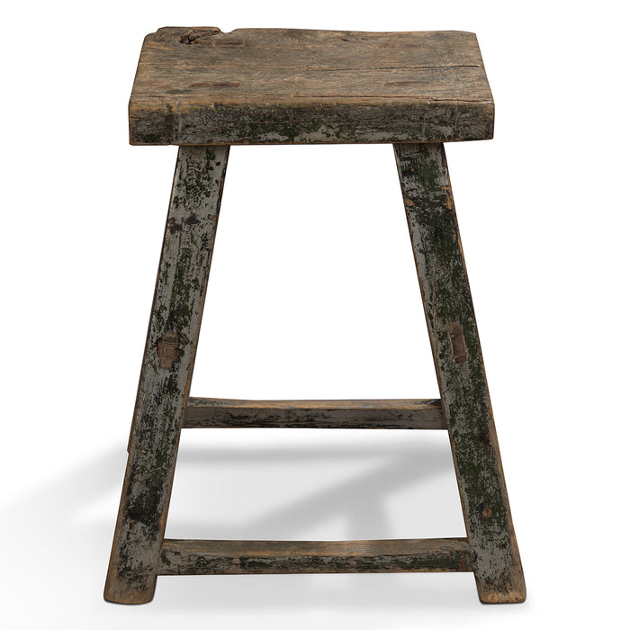 Crafted from elm wood, this authentic Chinese stool exemplifies traditional joinery with its A-frame construction and mortise-and-tenon joinery. The weathered seat bears the patina of time, while the legs retain vestiges of original lacquer work. Single stretchers provide structural stability across the frame. Lightweight and easily transportable, it serves equally well as additional seating, a compact side table, or a practical accent piece throughout your home.