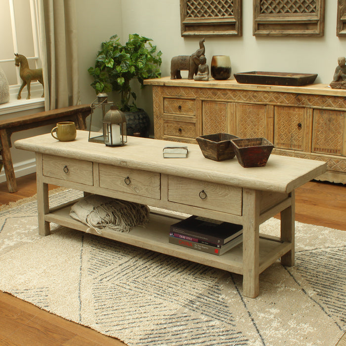 Cette table basse a été nouvellement fabriquée à partir de vieux bois d'orme, laissés dans une finition très naturelle qui met en valeur le grain profond et attrayant du bois. Trois tiroirs à l'avant sont chacun équipés d'une simple poignée en anneau et l'étagère solide en dessous offre un espace de rangement supplémentaire pour les unités multimédias ou les magazines. Parfaite comme meuble TV, la table pourrait également être utilisée comme table basse ou même au bout d'un lit pour s'asseoir et ranger.