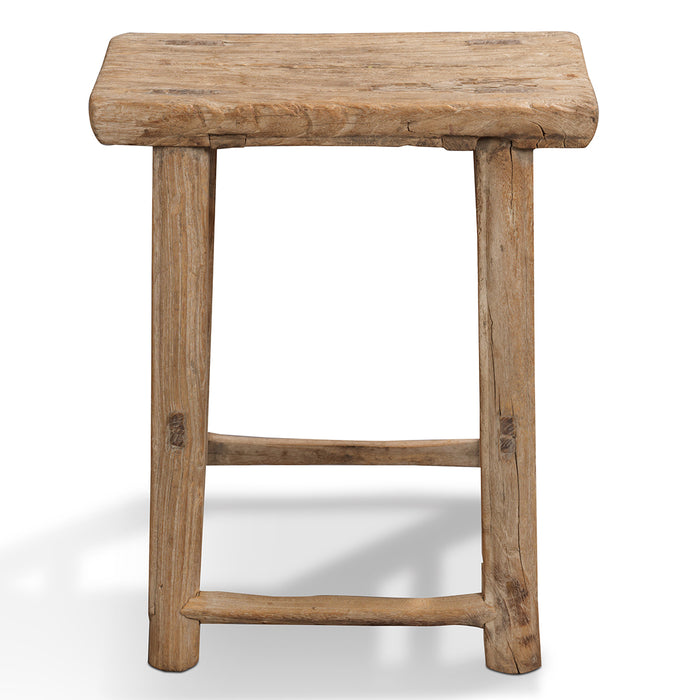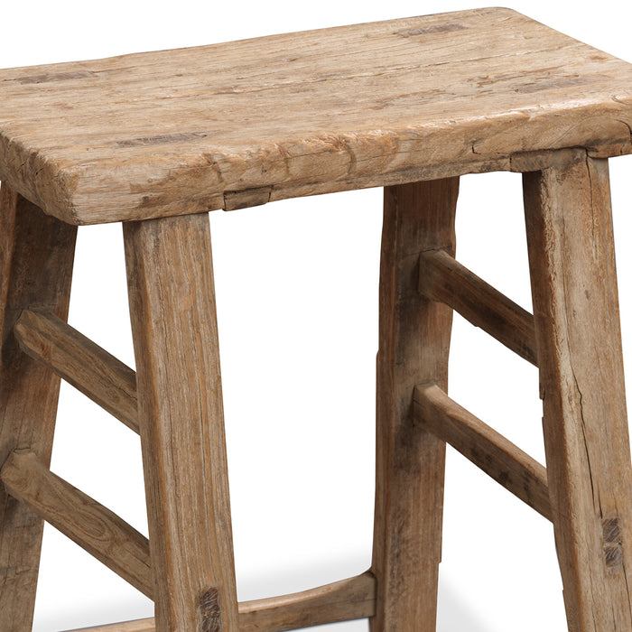 Crafted from deep-grained elm wood, this authentic Chinese stool embodies a timeless design seen in China for centuries. Its sturdy A-frame construction features mortise-and-tenon joinery, the legs supported by double stretchers and slotting directly into the chunky weathered seat above. The rustic finish and simple style would fit easily into any interior, while the stool is lightweight enough to be moved around to suit different purposes. Whether employed as additional seating, or as a compact side table, it's a versatile item with a unique character.