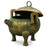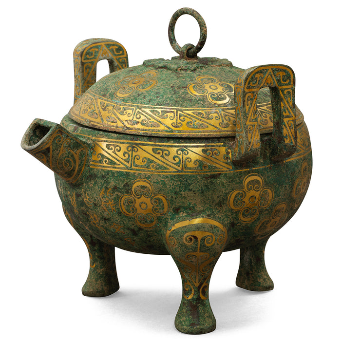 Cet objet inhabituel est une reproduction d’un ancien récipient à vin chinois Hé en bronze. Coulée en bronze et incrustée d'or, la finition est un joli vert-de-gris vieilli. Des récipients comme celui-ci ont été produits en Chine dès la dynastie Shang (1600 - 1045 av. J.-C.), utilisés soit pour stocker et filtrer le vin lors de cérémonies rituelles, soit pour être enterrés dans les tombes des membres les plus hauts placés et les plus riches de la société.