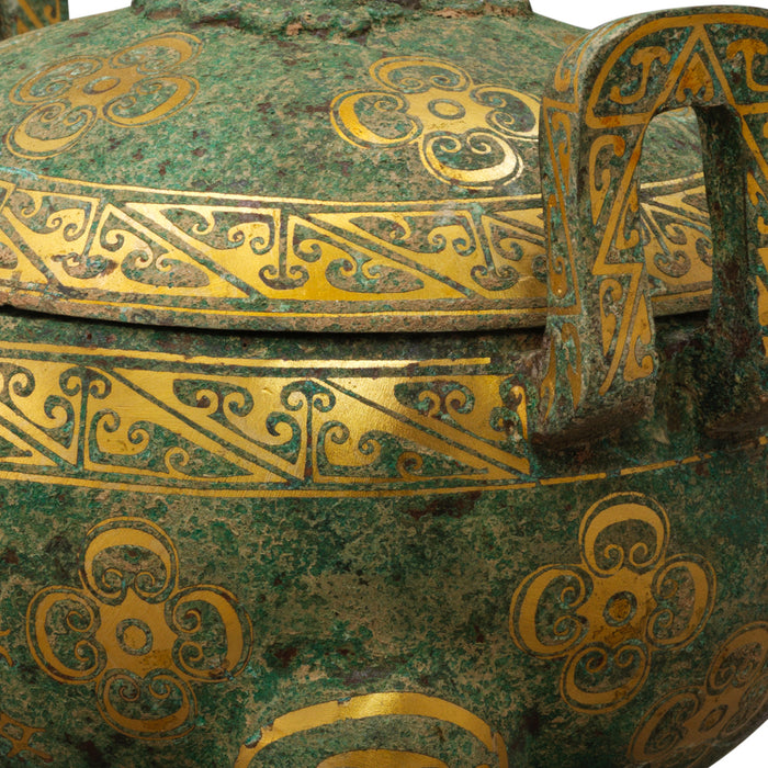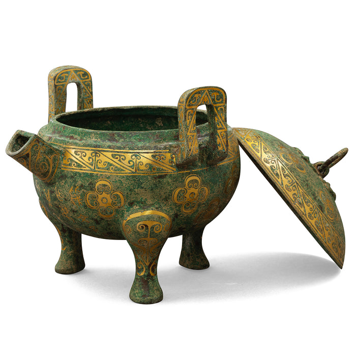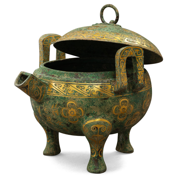 Le « Hé » - un grand récipient en forme de théière à couvercle avec trois pieds et un bec pointant vers le haut - était l'un des nombreux récipients produits en bronze ou parfois en céramique, qui étaient enterrés ensemble comme un ensemble. Celui-ci repose sur trois pieds cabrioles et possède un couvercle en forme de dôme peu profond. Il est incrusté d'or selon un motif à volutes diagonales autour du corps et du couvercle, ainsi que des fleurs à quatre pétales. Notez que chaque élément est moulé individuellement et que la finition peut donc varier légèrement par rapport à l'exemple présenté ici.