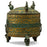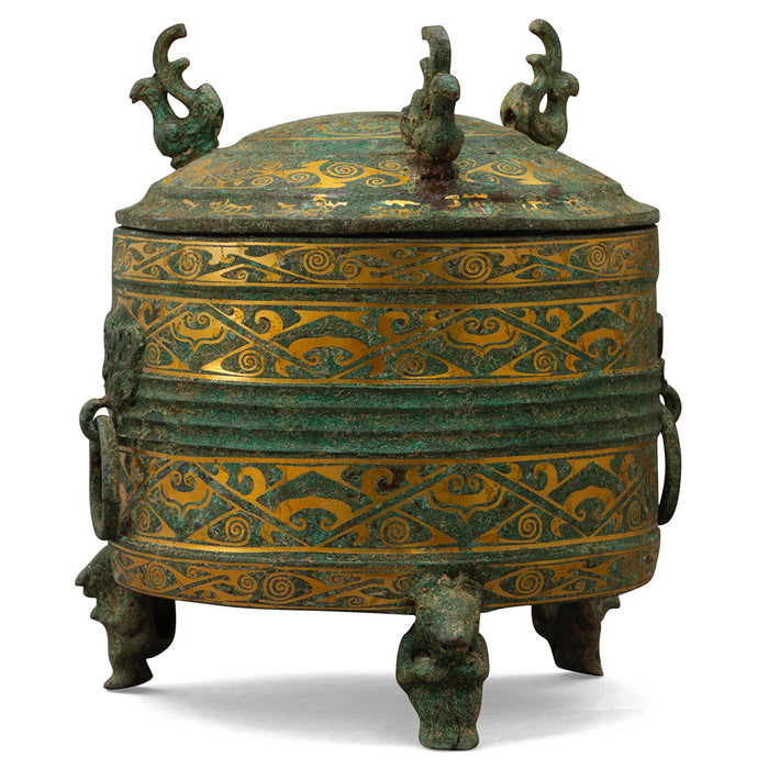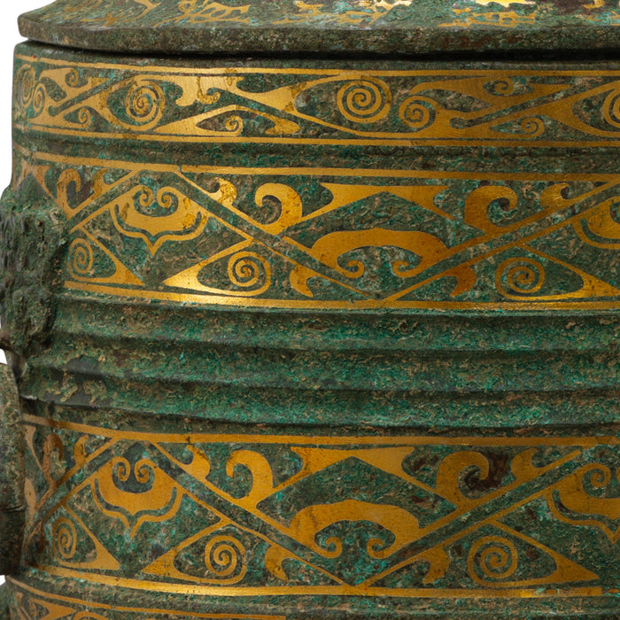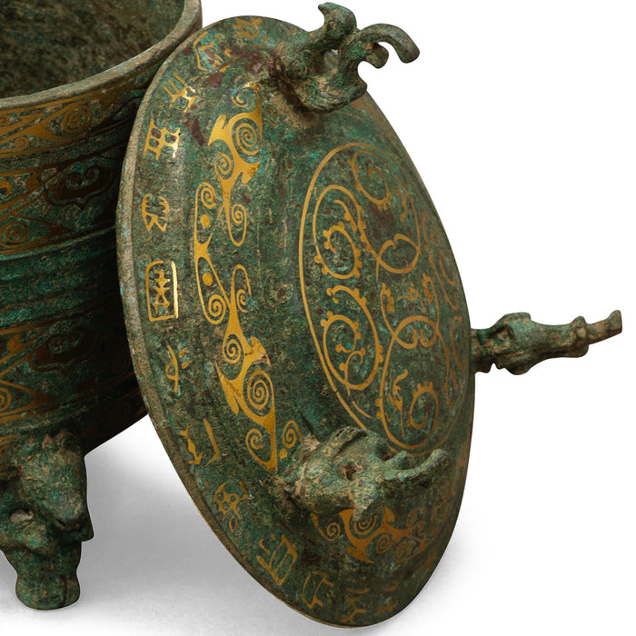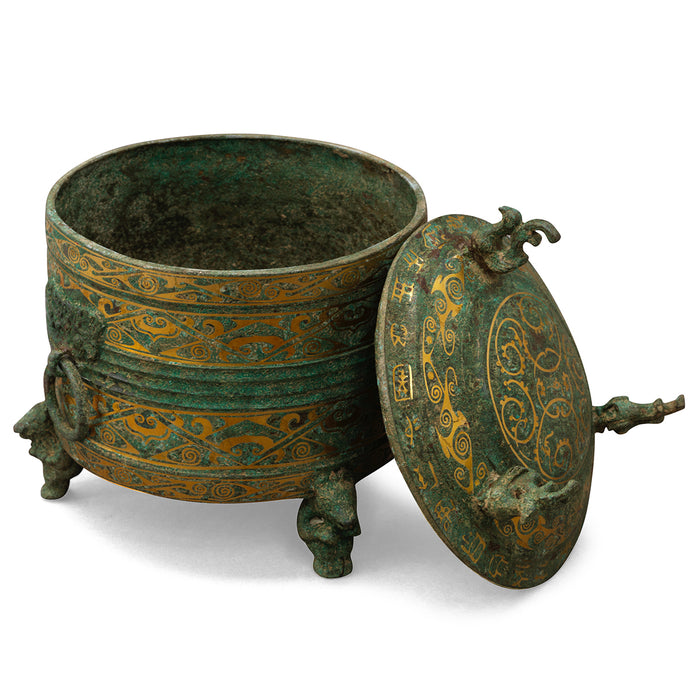 Cette conception particulière est appelée « dui » et aurait été utilisée pour les céréales ou d'autres aliments. En bronze vieilli vert-de-gris, il repose sur trois pieds courts en forme d'animaux, avec un couvercle bombé peu profond avec des poignées d'oiseaux. Le corps circulaire est muni d'une poignée en anneau de chaque côté et incrusté d'or avec un motif de volutes. Le couvercle est incrusté d'un motif circulaire imbriqué sur le dessus, ainsi que de divers hiéroglyphes chinois. Notez que chaque vase est moulé individuellement et que la finition peut donc varier légèrement par rapport à l'exemple présenté ici.