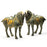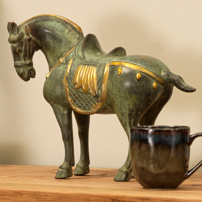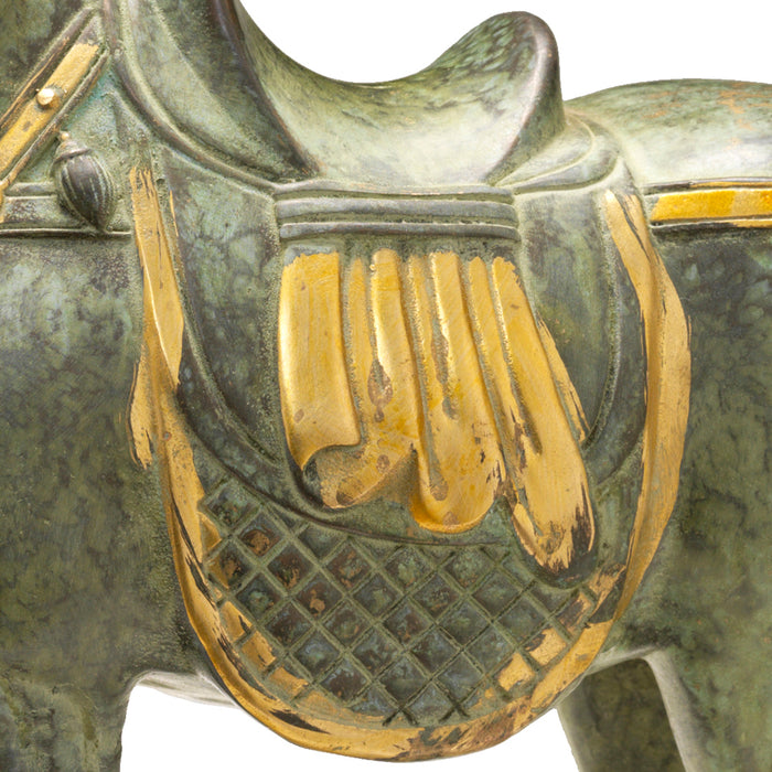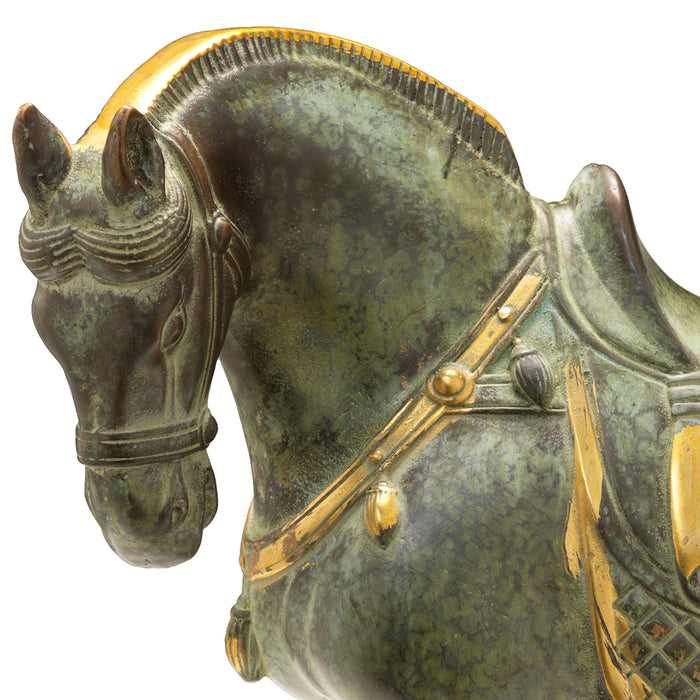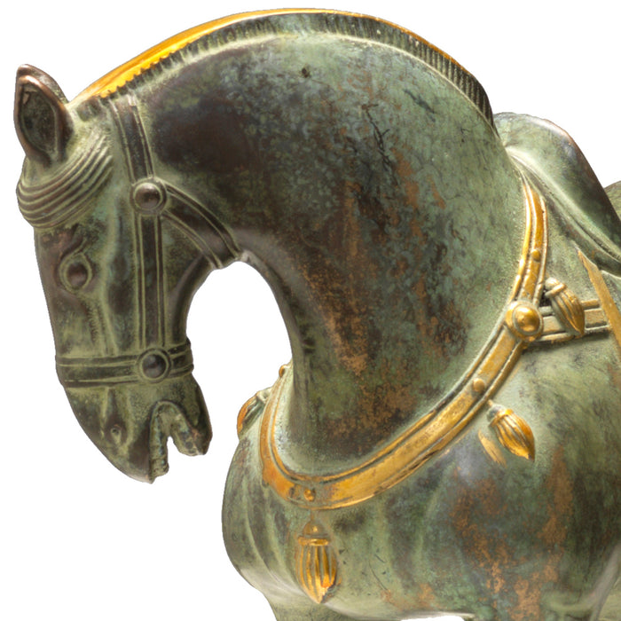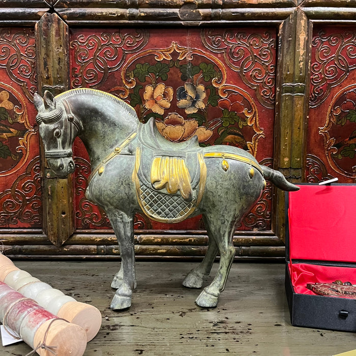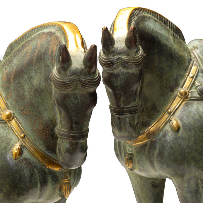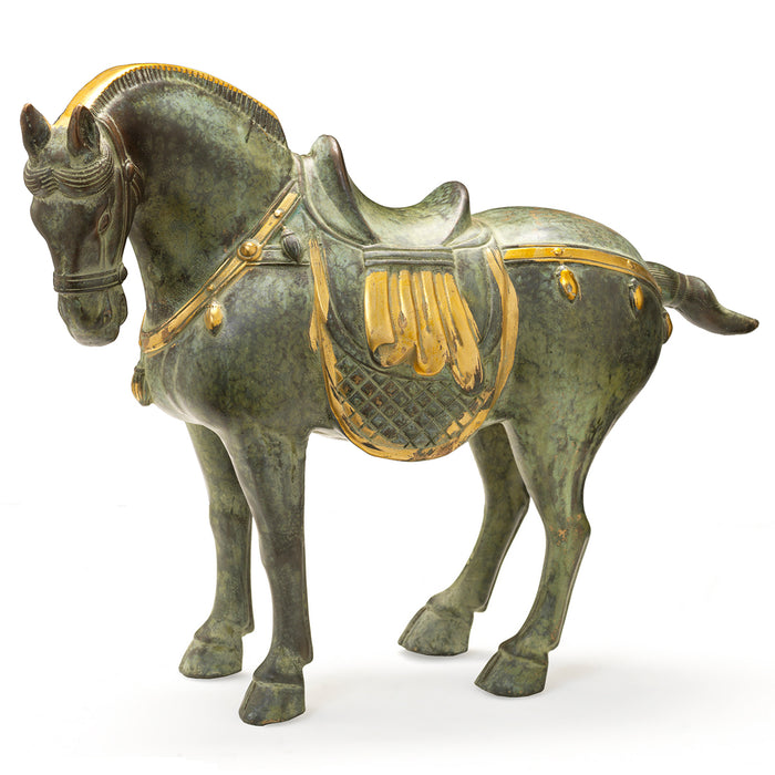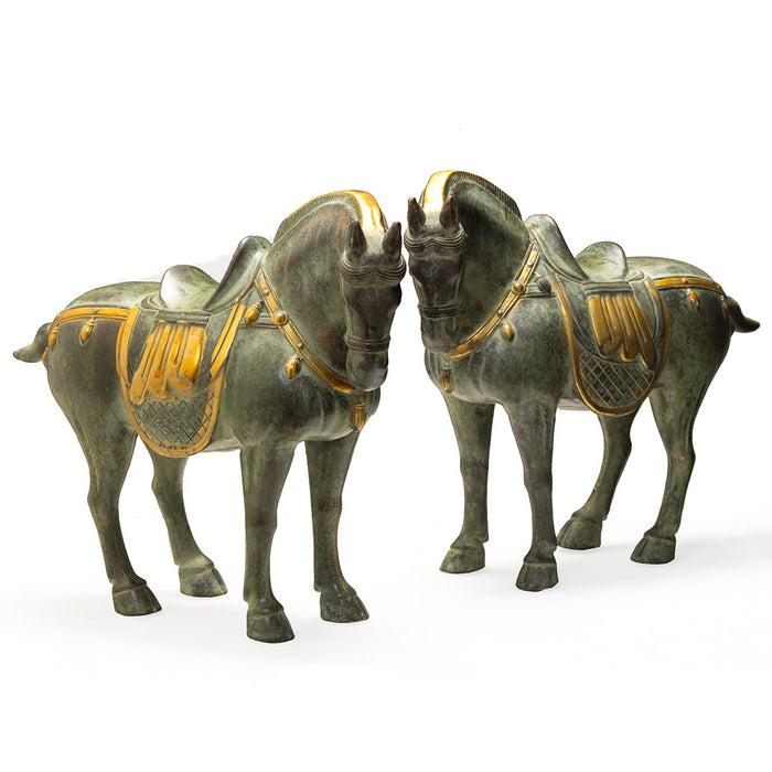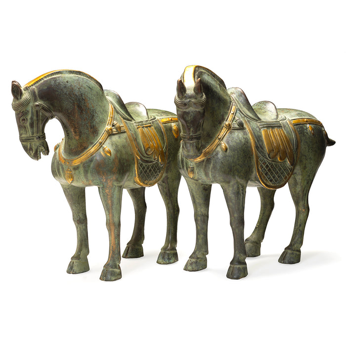 These beautiful horses are cast in bronze in a verdigris finish and are reproductions of an ancient design from the Han dynasty. The horse is shown saddled, with head down, looking either to its left or right. A beautiful ornament for a horse lover and available either individually or as a matching pair facing in opposite directions. The price shown is for a single horse.