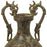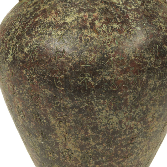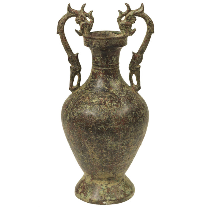 Cet élégant vase en bronze est une reproduction des récipients à vin utilisés dans la Chine ancienne pour les rituels. Le corps principal du vase et la base sont gravés de caractères chinois anciens et le col mince est flanqué de chaque côté d'anses étroites en forme de dragons stylisés. Notez que chaque vase est moulé individuellement et que la finition peut donc varier légèrement par rapport à l'exemple présenté ici.