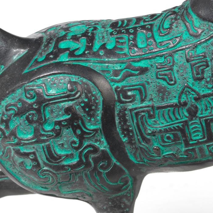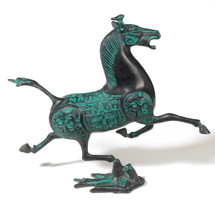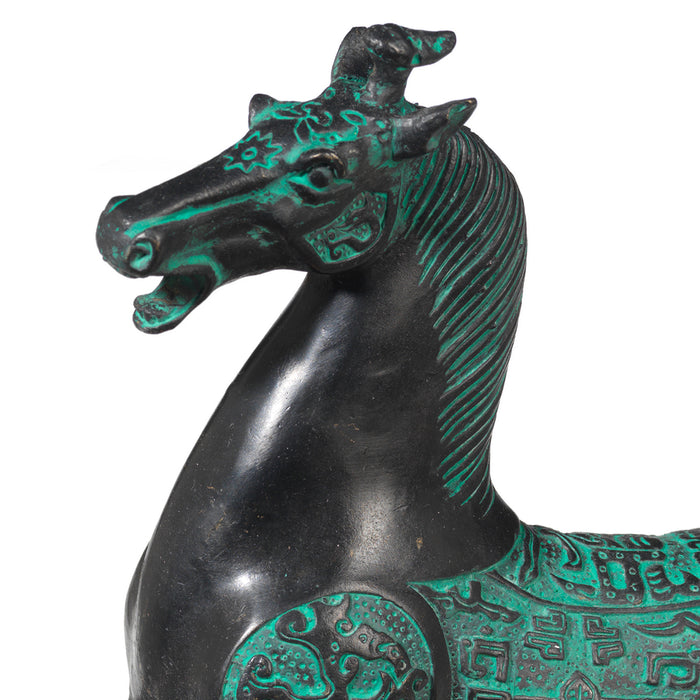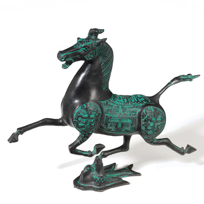 Ce cheval en bronze coulé est une reproduction d'un cheval similaire découvert dans la province du Gansu en 1969 et datant de la dynastie Han (206 avant JC - 220 après JC). L'original se trouve maintenant au Musée provincial du Gansu, mais celui-ci est dans la même pose, montré au milieu du galop avec un de ses sabots sur une hirondelle volante - une pose qui a donné son nom au cheval de la dynastie Han - le "Cheval volant du Gansu". . La base sombre est magnifiquement gravée autour du dos, des flancs et de la tête du cheval en vert-de-gris, incorporant d'anciens hiéroglyphes chinois.