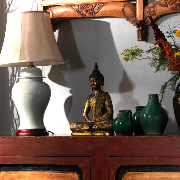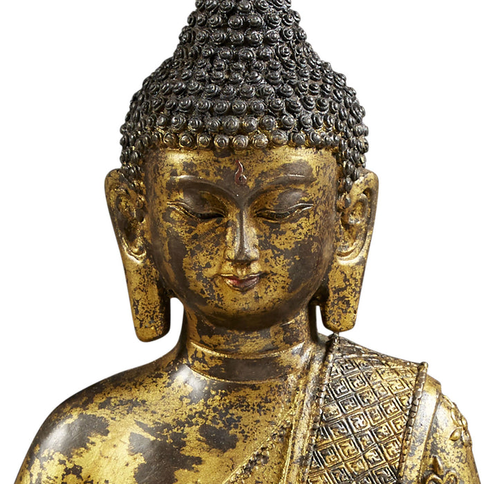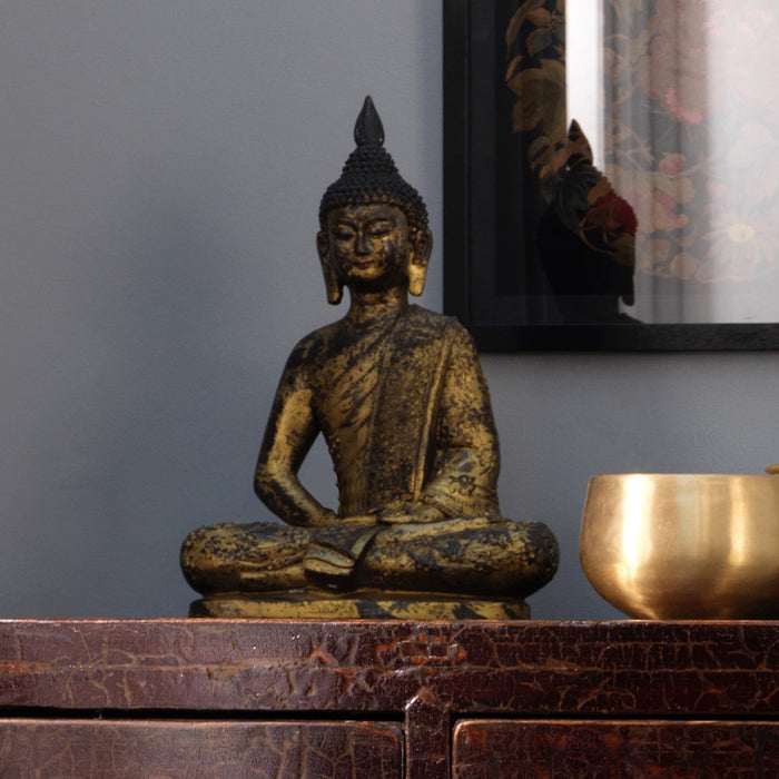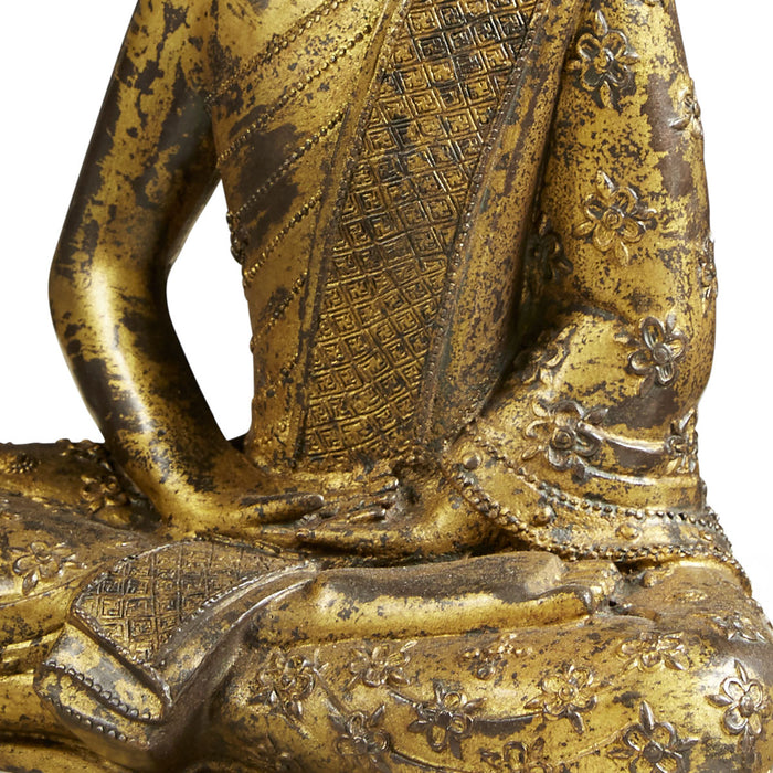 Ce Bouddha assis serein est moulé en bronze mais avec une finition dorée vieillie. Le Bouddha est assis avec les mains positionnées pour la méditation. Magnifiquement détaillée avec des fleurs sur les robes du Bouddha, la figurine est une reproduction nouvellement réalisée, « vieillie » pour donner une finition d'aspect antique.