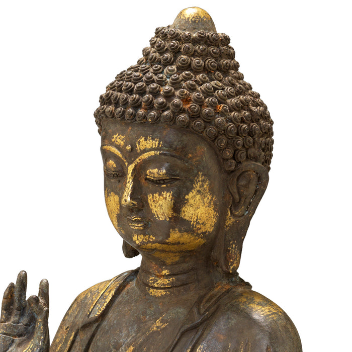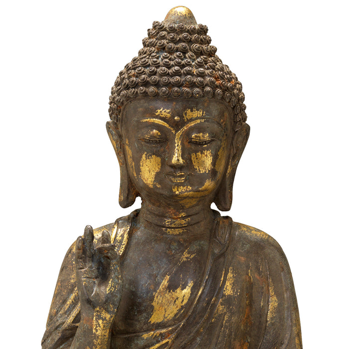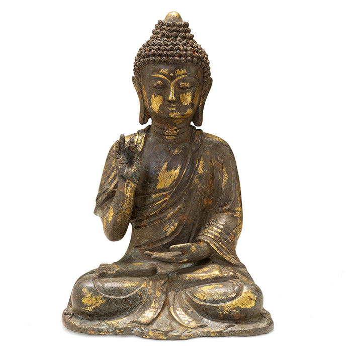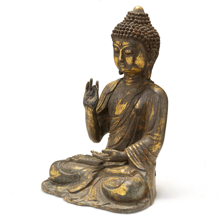 The Buddha is shown here with the right hand raised and facing outwards, representing protection and the overcoming of fear and anger. The figure is a replica made in cast bronze and a with a worn appearance accented with gold hints for an aged look. Note that, as every statue is hand-crafted, the final finish may have minor variations compared to the example shown.