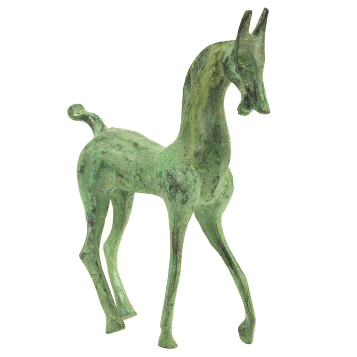 Ces petits chevaux font de jolis ornements, individuellement ou en paire. Coulés en bronze à la finition vert-de-gris, ils sont posés avec un pied avant en avant. Le prix indiqué est pour un seul cheval.