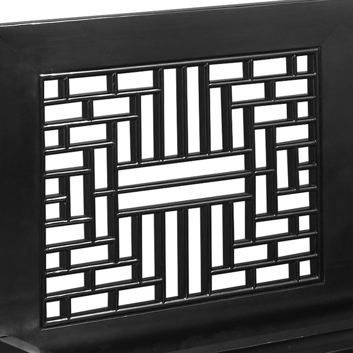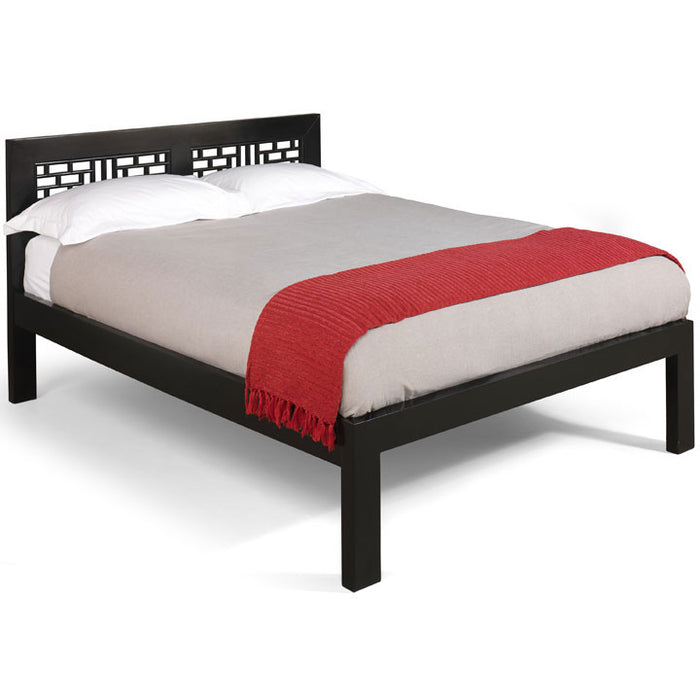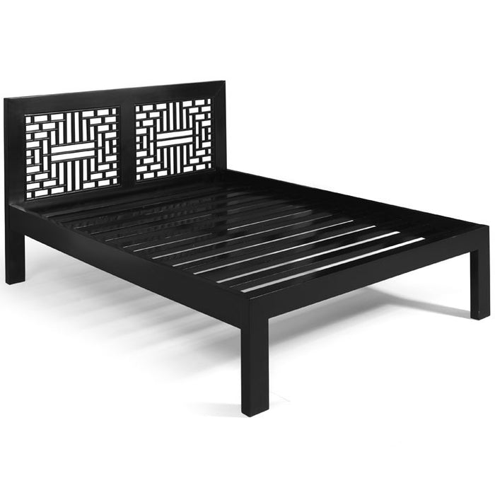 Ce magnifique lit laqué noir est disponible dans une gamme de tailles allant du simple à l'empereur et est fabriqué en bois d'orme massif. Le lit est composé de quatre sections avec des lattes en bois et s'assemble facilement. Le treillis de la tête de lit est réalisé à l'aide de morceaux de mots individuels assemblés par tenon et mortaise. Le design remonte à la dynastie Ming en Chine et peut également être vu sur notre paravent sculpté Ming. Des panneaux en treillis comme celui-ci étaient utilisés dans les fenêtres ou les portes intérieures et extérieures, divisant les zones d'une maison chinoise ou offrant une belle vue sur l'extérieur.