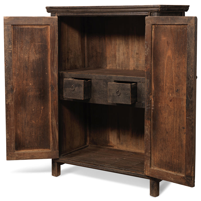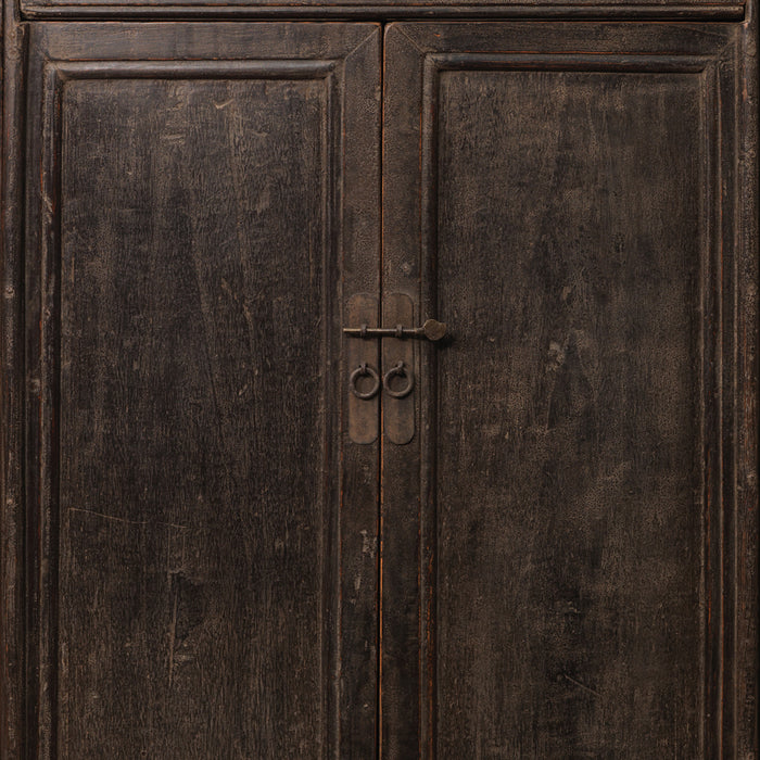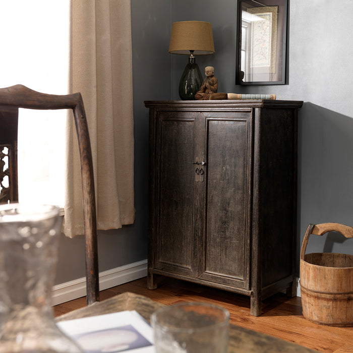 Le design pur et assez austère de ce meuble s'est développé très tôt en Chine et est généralement appelé un style « aux coins arrondis ». Plutôt que d'utiliser des charnières métalliques, les portes sont montées directement dans le cadre supérieur et inférieur de l'armoire sur des chevilles en bois, donnant un aspect simple et minimaliste. Les portes pleine longueur sont placées dans de larges cadres moulés et équipées de la quincaillerie d'origine. La finition laquée noire du meuble est usée mais en grande partie encore intacte, révélant simplement le bois d'orme plus clair dans certaines parties autour des pieds et des cadres. La surface supérieure a une belle patine, avec la laque craquelée par endroits pour donner un caractère merveilleux. L'armoire comporte une seule étagère fixe profonde à l'intérieur, dotée de deux petits tiroirs. D'un design intemporel qui a duré des siècles en Chine, le meuble est dans un état très original et ornerait n'importe quel intérieur d'aujourd'hui.