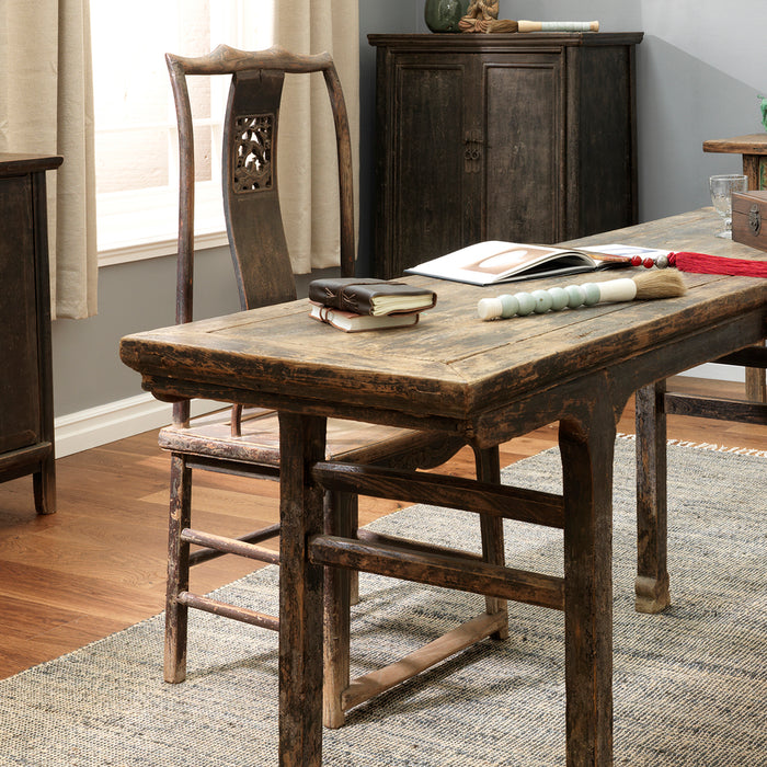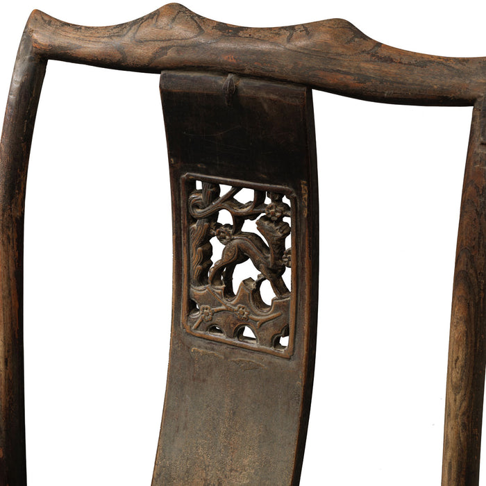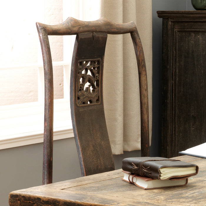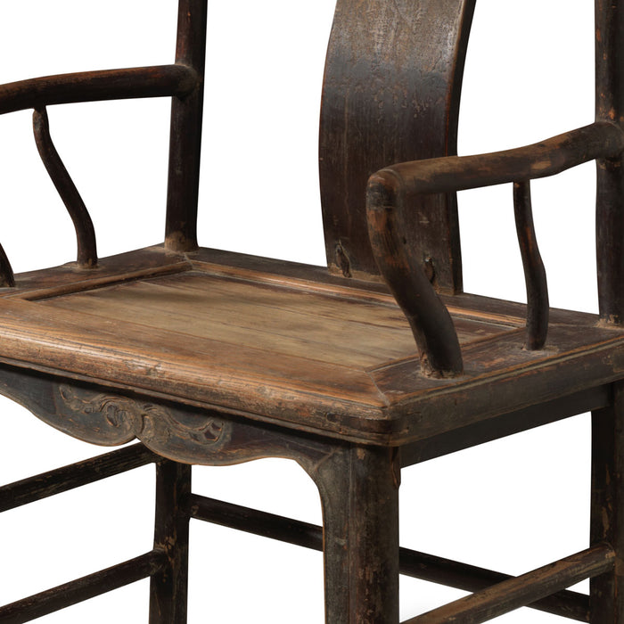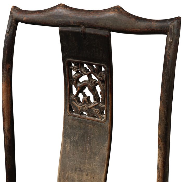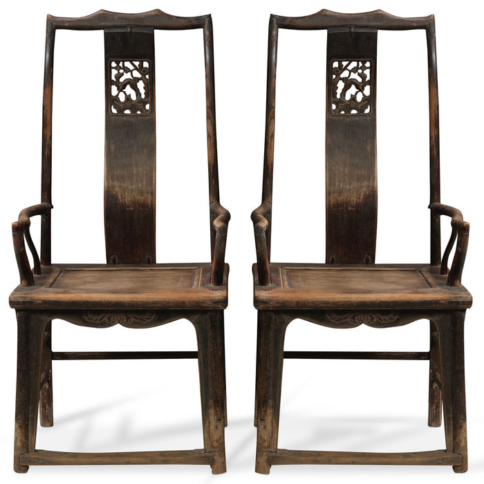 Ces magnifiques fauteuils proviennent de la province du Shanxi et ont des dossiers inhabituellement hauts, ce qui leur donne une apparence très grandiose. Fabriqué en orme et dans sa finition d'origine, la laque foncée s'est usée sur les sièges et le repose-pieds pour montrer la couleur plus pâle et plus naturelle du bois. Les longs dossiers sont en forme de courbe en « S » peu profonde pour plus de confort et sont chacun sculptés dans un joli motif représentant un cerf, représentant la longévité, situé au milieu d'arbres et de fleurs. Les rails supérieurs sont incurvés dans un style typique des chaises Shanxi et rejoignent les montants de siège subtilement incurvés de chaque côté. Il s’agit de l’une des paires de chaises les plus inhabituelles et les plus rares que nous ayons eu la chance de trouver et elles ajouteraient un véritable facteur époustouflant à une salle de réception ou à un couloir.