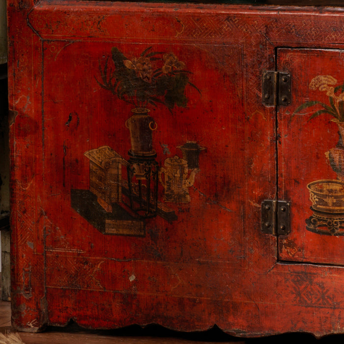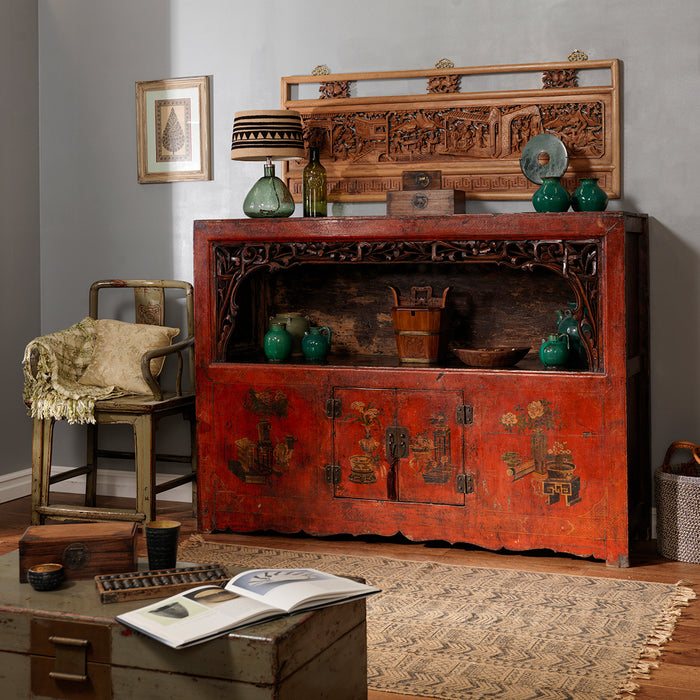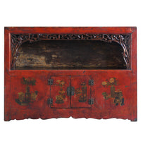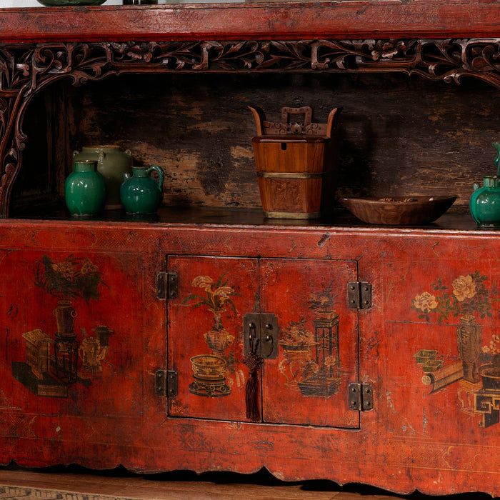 Cette superbe armoire, avec une étagère ouverte dans la partie supérieure, provient du Qinghai, dans l'ouest de la Chine, et la laque de cinabre rouge vif et les peintures décoratives sont typiques de cette région. Autrefois utilisée pour contenir des livres et exposer des ornements préférés, elle serait aujourd'hui à l'aise comme grande bibliothèque ou présentoir. Il est dans un état très original, avec les anciennes couleurs, sculptures et peintures intactes. Souvent, des armoires comme celle-ci sont réduites pour former des buffets inférieurs, mais celui-ci est dans ses anciennes proportions. Les sculptures complexes autour de l'étagère présentent un motif floral, assorti aux peintures de vases à fleurs de la partie inférieure. Comme c'était courant pour les meubles Qinghai, les petites portes sont placées au centre, mais donnent accès à tout l'espace inférieur à l'intérieur.