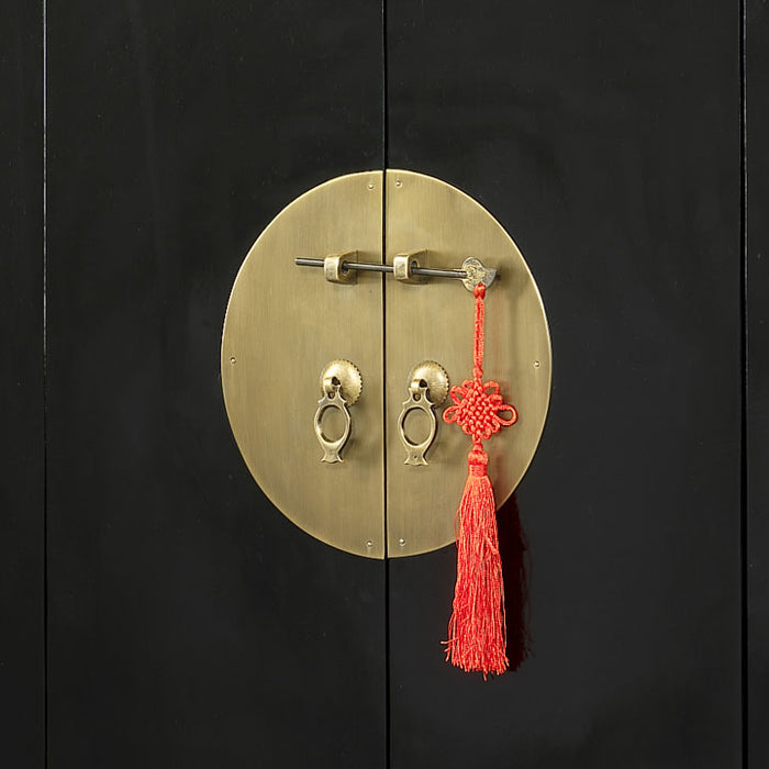 Avec sa quincaillerie circulaire authentique en laiton et ses charnières comme on le voit sur de nombreuses pièces originales de meubles chinois. L'espace interne au-dessus de l'étagère mesure L102 x H65 cm (convient pour un téléviseur de 37" et jusqu'à 42"), il y a également un espace sous l'étagère pour les lecteurs DVD, les Sky box, etc. qui mesure 15 cm de haut. Avec l'ajout de deux tiroirs au bas de l'armoire, parfaits pour ranger d'autres unités multimédias.