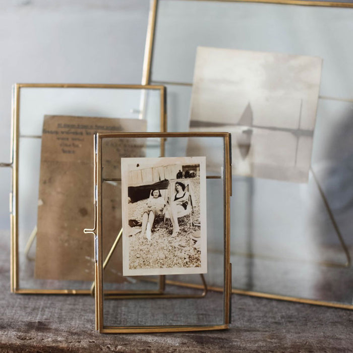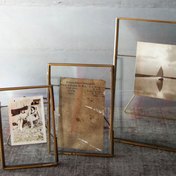 Fabriqués en laiton antique et soudés à la main, ces cadres simples mais élégants sont très populaires. Les doubles panneaux de verre installés à l'intérieur permettent de placer des photographies ou d'autres souvenirs à l'intérieur. Le résultat est une façon pure et élégante d’afficher vos souvenirs. Choisissez parmi trois tailles standards. Convient uniquement à l'orientation portrait.