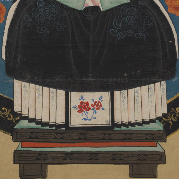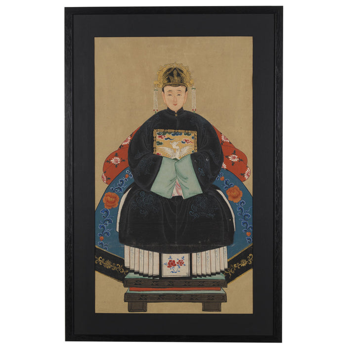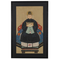 Les portraits d'ancêtres constituent une partie importante de la pratique chinoise du culte des ancêtres, créés sous forme de ressemblances grandeur nature du défunt. Les familles honoraient et commémoraient leurs ancêtres, accomplissant des rituels et offrant des offrandes. Nos portraits sont des répliques plus petites des originaux, mais sont par ailleurs des versions précises des peintures anciennes. Ils sont fournis montés et encadrés comme indiqué.