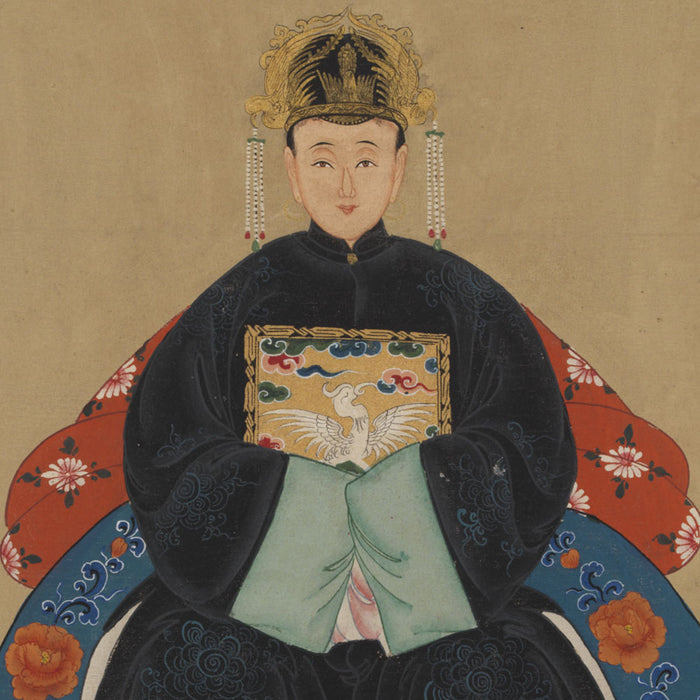 Celui-ci montre l’épouse d’un haut fonctionnaire vêtue de robes noires. L'insigne carré d'oiseau sur le devant indique le rang civil de son mari. Des oiseaux tels que des grues, des paons et des canards étaient utilisés pour des postes civils, tandis que des animaux tels que des lions et des tigres étaient utilisés pour les grades militaires.