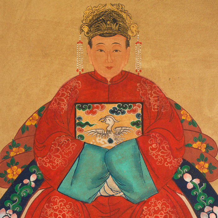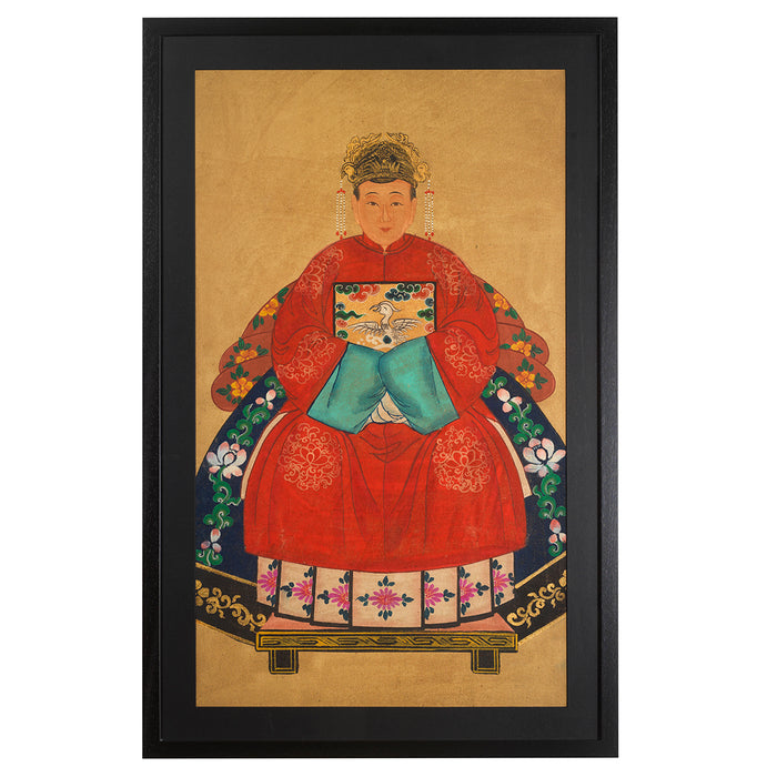 Les peintures d’ancêtres ont joué un rôle important dans la pratique du culte des ancêtres en Chine pendant des siècles, avant l’avènement de la photographie. Les familles se souvenaient et adoraient leurs ancêtres avec des offrandes placées devant ces peintures. Les portraits étaient peints de face et étaient généralement proches de la taille réelle, les sujets étant assis et vêtus de robes formelles pour montrer leur insigne de grade. Les peintures originales d’ancêtres sont désormais rares et très recherchées. Nos peintures sont des reproductions et de plus petite taille, mais sont des versions fidèles de peintures anciennes. Ils sont fournis montés et encadrés comme indiqué. Celui-ci représente l'épouse d'un haut fonctionnaire vêtue de robes de couleur rouge vif, comprenant l'insigne de la grue qui signifiait la position de son mari. Les dessins peuvent varier légèrement des exemples présentés car chaque tableau est individuel.