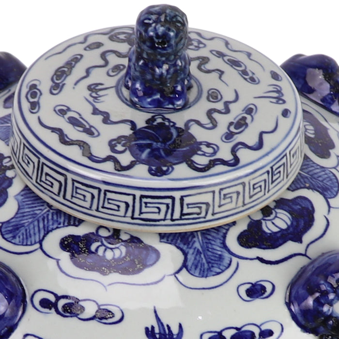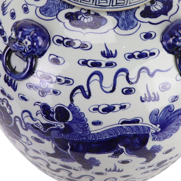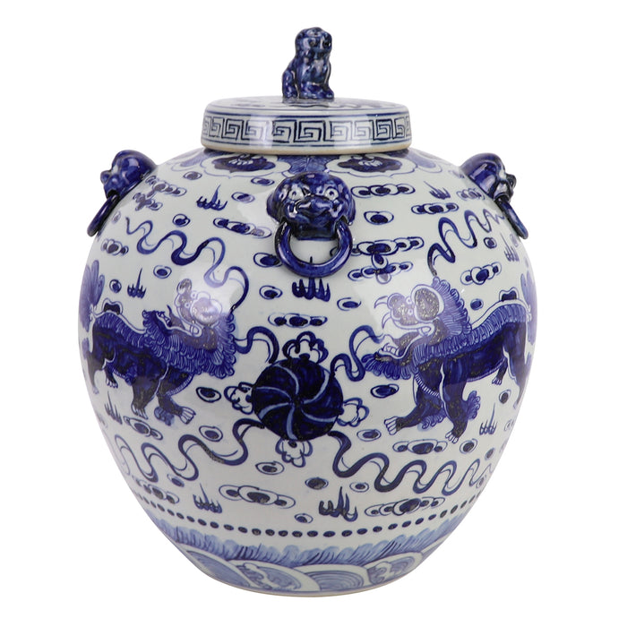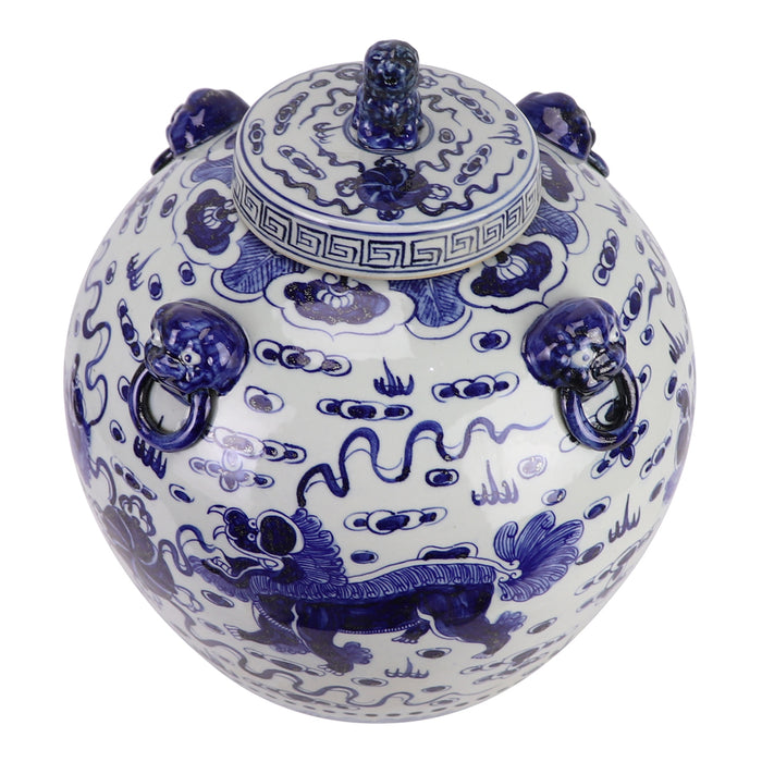 These exquisite, oversized jars feature a pair of opposing 'foo dogs' or temple lions, protective guardians in Chinese culture and traditionally found at the entrance to temples and other important buildings. Each jars has four lion head handles and a lid topped with a furhter temple lion. Handcrafted in Jingdezhen, the traditional hub of porcelain production in China for centuries, the jars are beautifully crafted by hand on a traditional potter's wheel. The rich blue tones against the white base are achieved using a traditional cobalt pigment and finished with a clear glaze.