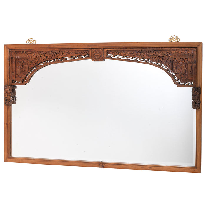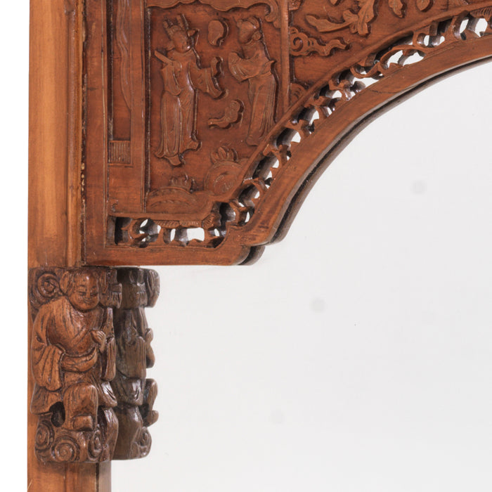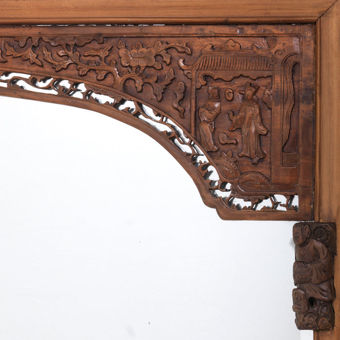 Originaire de la province du Hebei, dans l'est de la Chine, la partie sculptée de ce miroir servait autrefois de linteau décoratif de porte et date du début du siècle dernier. Fabriqué à partir de bois de hêtre, il aurait orné le sommet d'une entrée d'une pièce d'une maison riche, avec des murs constitués de panneaux de bois sculptés de la même manière. Les linteaux de ce type avaient tendance à suivre une conception similaire, souvent avec un décalque central sculpté et deux ailes sculptées de chaque côté, placés dans un cadre terminé à chaque extrémité par des sculptures de personnages, de chiens fu ou de « glands » en bois. En le reconvertissant en miroir, le linteau a retrouvé une nouvelle vie, offrant un cadre arqué parfait pour le verre.