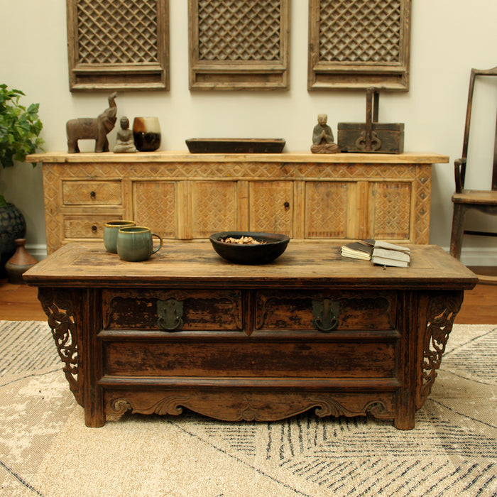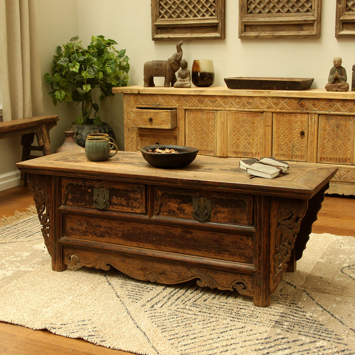 This lovely low table would make a wonderful, unusual TV stand in a modern home, or could be used as a coffee table. It was produced in Shanxi province towards the end of the nineteenth century, where it would have been placed on a home's 'kang' - the raised platform that would be heated from below and which provided the main living space during colder months. The table is beautifully made and in an elegant style, with finely carved side spandrels both at the front and back depicting scrolling dragons, and a narrow carved apron across the front. The original dark finish is still present but worn to varying degrees on the front and top of the table, creating a wonderful, aged patina that adds to the table's character. The two drawers, each with their old hardware, can be removed to access a 'hidden' storage space below, once used to hold more valuable documents or personal effects.