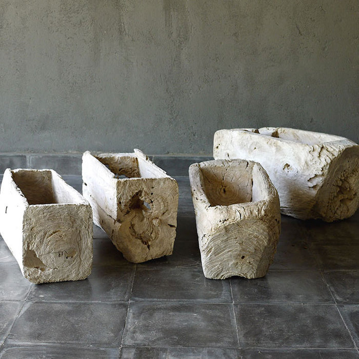Ces grosses auges en bois patiné ont été taillées dans le tronc d'un teck et proviennent de la péninsule javanaise de Lesung. Ils sont parfaits comme jardinières pour une utilisation en intérieur ou en extérieur. Notez que chacun varie légèrement en taille et en forme, les photos présentées ici sont donc fournies à titre d'exemple uniquement. Si vous souhaitez des photos des articles que nous avons en stock, veuillez nous contacter.