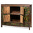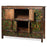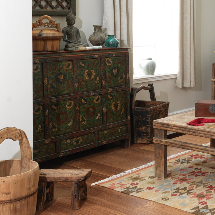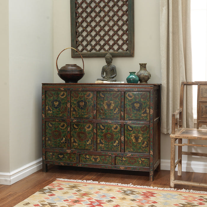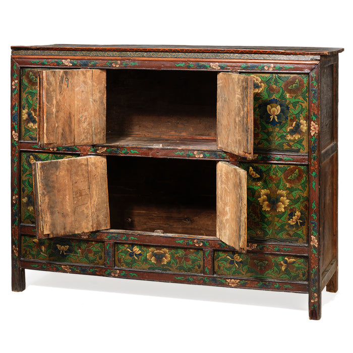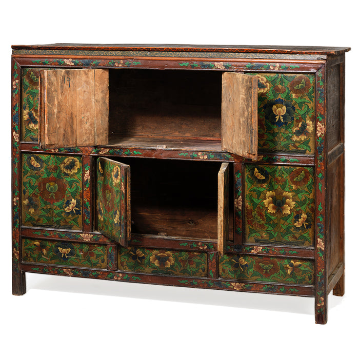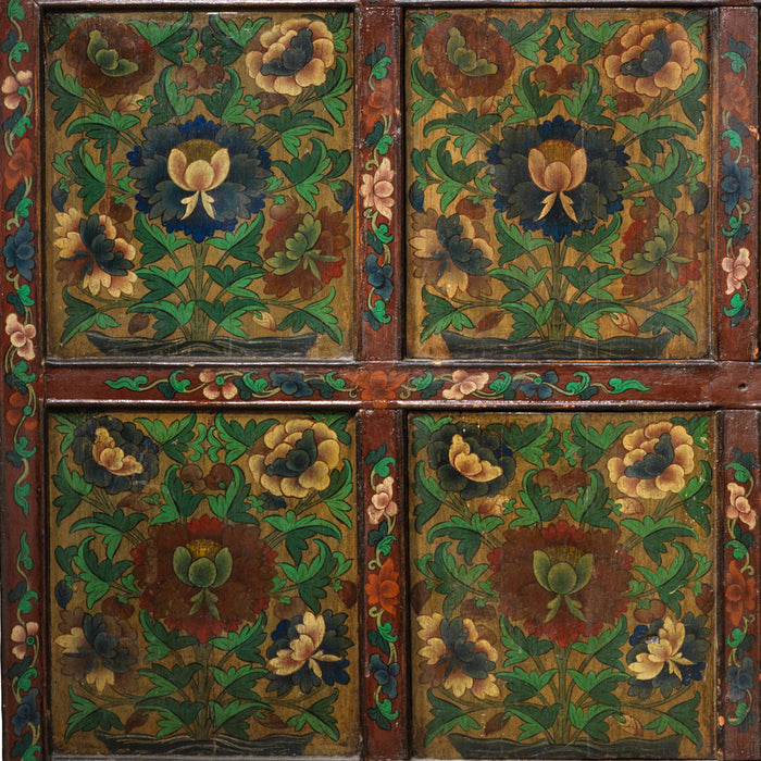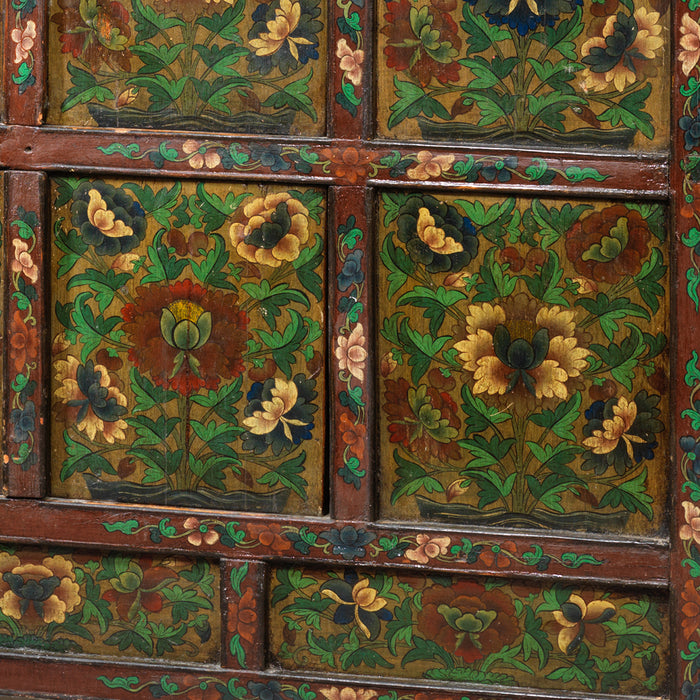 Les finitions et les peintures de ce meuble aux couleurs vives sont toutes anciennes, dans des couleurs typiques des meubles tibétains. Les panneaux de porte sont décorés de fleurs de pivoines entourant des symboles de longévité et d'autres motifs floraux figurent sur les cadres extérieurs et les panneaux inférieurs. Les panneaux supérieur et inférieur gauche sont fixes, tandis que les panneaux droit et central sont des portes qui s'ouvrent sur les compartiments supérieur et inférieur.