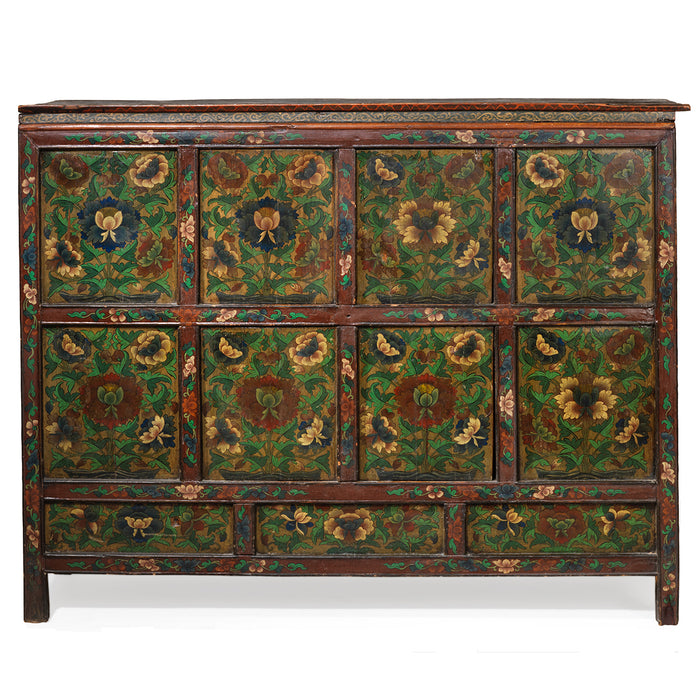 Les armoires comme celle-ci étaient généralement utilisées au Tibet pour contenir des rouleaux ou des documents religieux ainsi que des robes de cérémonie et des objets de valeur. Ils étaient normalement produits à partir de pin ou parfois de cèdre et étaient assez rudimentaires – souvent produits par des moines. Les meubles tibétains dans leur finition d'origine et avec des peintures anciennes comme ce meuble sont désormais assez rares, la plupart des pièces vues sur le marché de nos jours étant des reproductions du XXe siècle ou, dans certains cas, des pièces anciennes avec des peintures récemment appliquées. Celui-ci est donc une véritable pièce de collection.