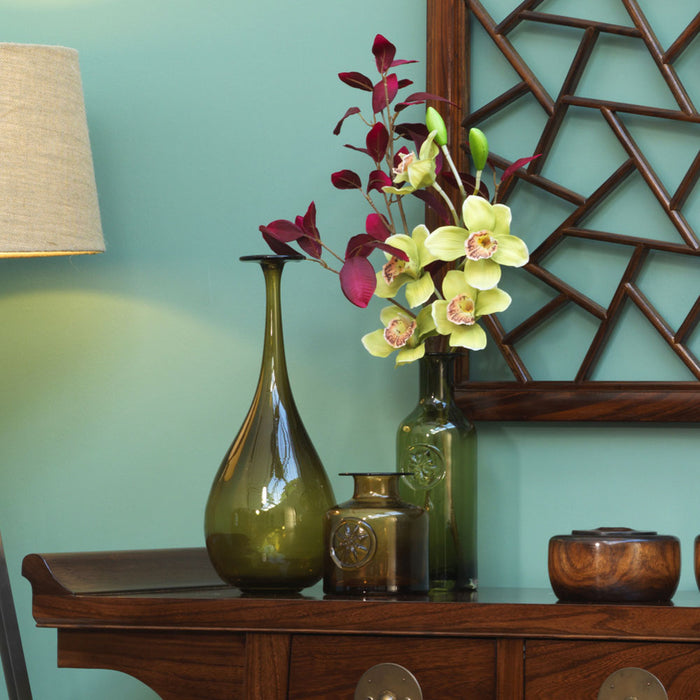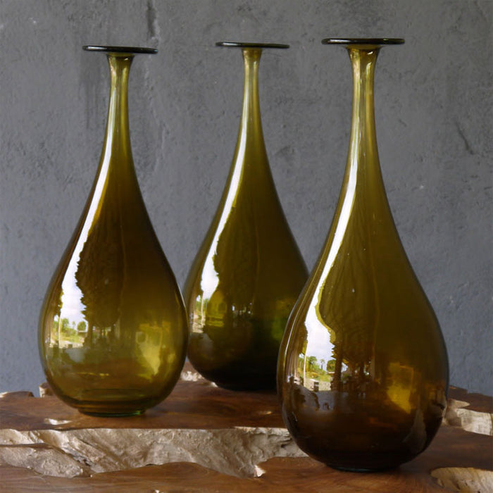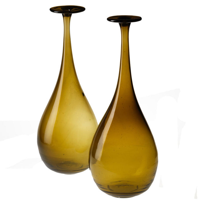 Ces vases en verre marron sont en forme de larme et sont soufflés à la main. Idéal pour contenir des fleurs ou simplement comme ornements. Le prix indiqué est pour chaque article.