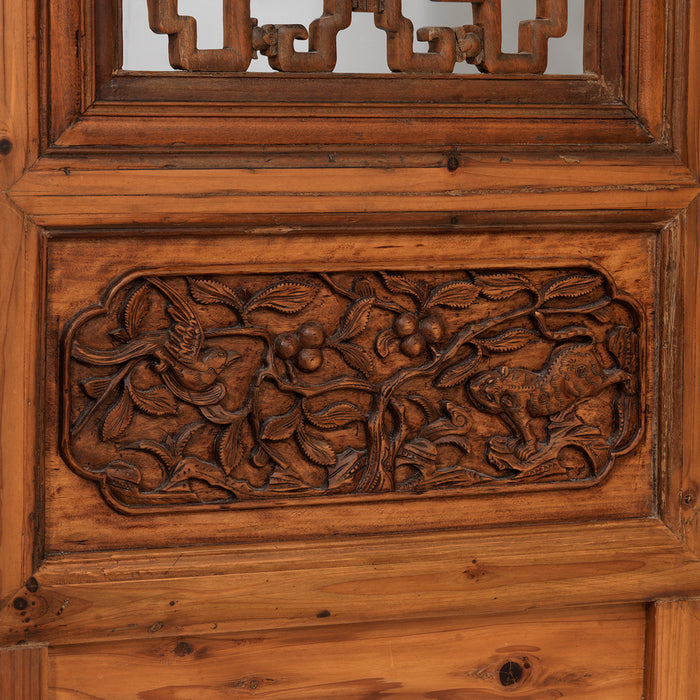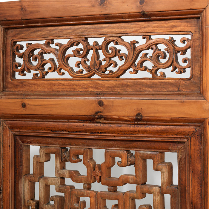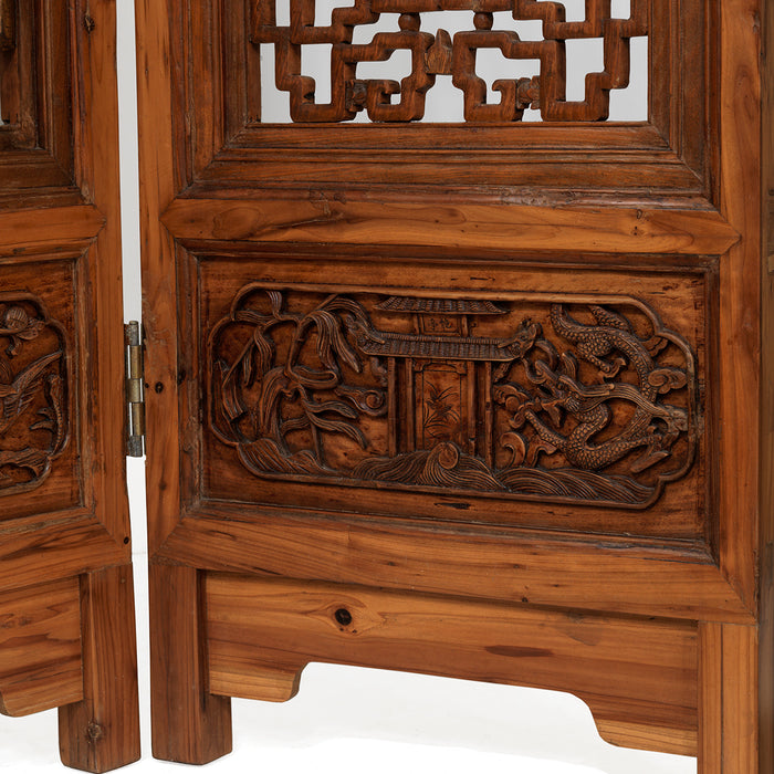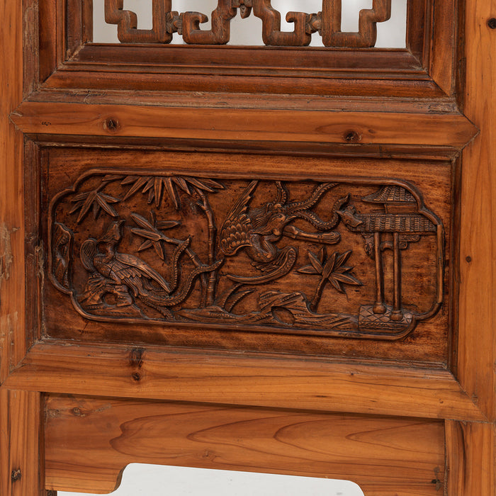 Ce superbe paravent date du milieu du XIXe siècle, où il a été produit pour une maison de la ville de Hangzhou, dans la province du Zhejiang. Il est fabriqué en bois d'orme et comporte quatre grands panneaux articulés pour créer un paravent de style accordéon. Les panneaux sont chacun divisés en trois sections, les petites sections supérieures et les grandes sections centrales étant sculptées d'un treillis complexe et les sections inférieures en relief.