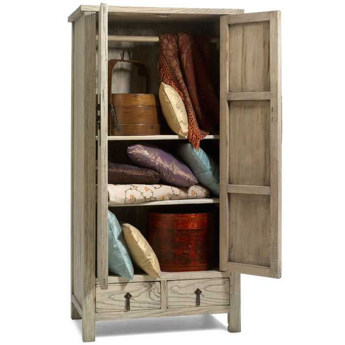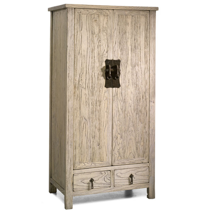 Cette armoire chinoise aux proportions élégantes met en valeur le merveilleux grain large et profond du bois d'orme récupéré à partir duquel elle est fabriquée pour un bel effet. La quincaillerie de porte et les poignées en laiton noirci contrastent joliment avec la finition en bois clair et naturel. Les portes sont montées sur des charnières traditionnelles en bois plutôt que sur des charnières modernes en métal, ce qui donne un aspect très pur et simple. L'armoire dispose d'une penderie amovible ainsi que de deux étagères amovibles, elle peut donc également être utilisée comme armoire de rangement plus générale ainsi que pour suspendre des vêtements.