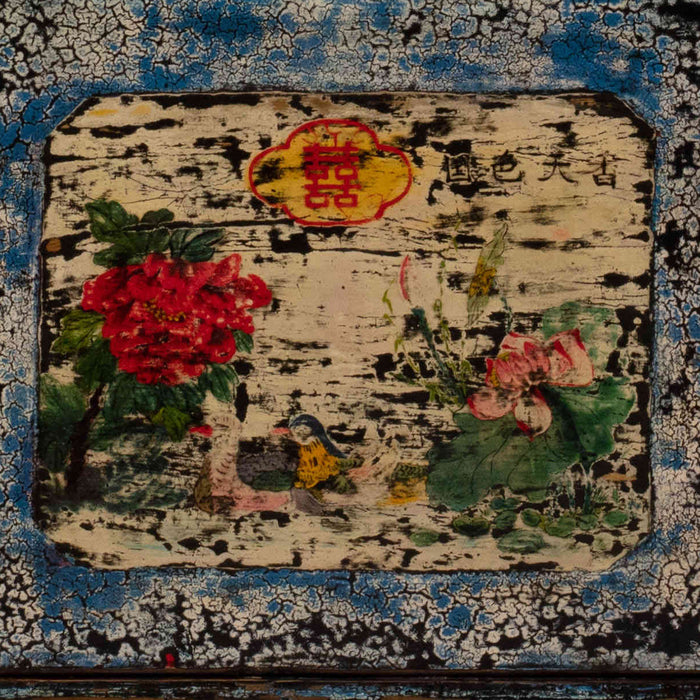 This charming cabinet features a crackled blue lacquer finish applied during restoration to rejuvenate its original surface. The delicate floral paintings of flowers in soft pinks, reds, and creams on the door provide a striking contrast. Repurposed from an old storage unit, the door has been added using what was once a fixed panel. Ideal as a pretty storage cabinet in a living room or bedroom, its fresh colours would complement a variety of interior styles.
