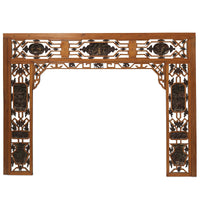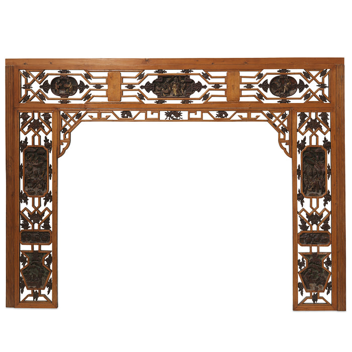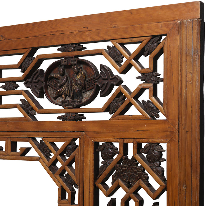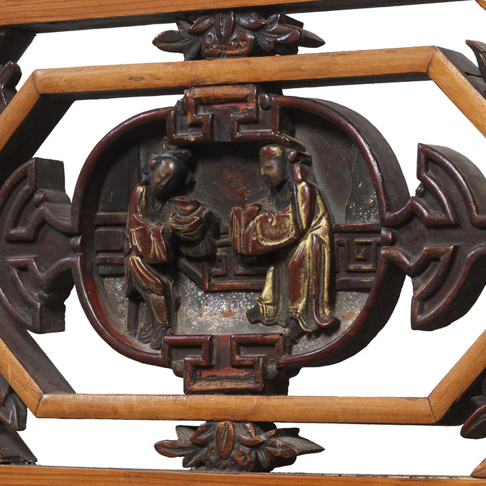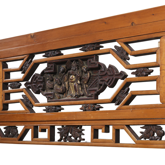 Magnifiquement fabriqué à la main à partir de bois de pin et de hêtre, ce fascia de lit conjugal complexe est une œuvre d’art. Il est originaire de la province du Jiangsu, ou peut-être de l'Anhui voisin, et présente de fines sculptures en relief profond inscrites dans des motifs géométriques. Les différentes grandes sculptures montrent divers personnages et scènes de la mythologie chinoise, aux finitions soignées et merveilleusement détaillées. Ceux-ci sont d’un brun foncé profond et auraient autrefois été choisis en or brillant. Des traces d'or sont encore en place dans certaines parties, mais elles sont largement usées sur la base plus foncée qui contraste joliment avec l'encadrement en bois plus pâle.