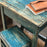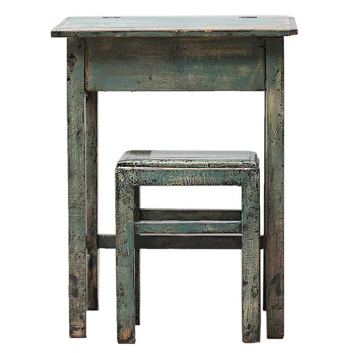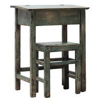 Ce vieux bureau d'école et son tabouret assorti ont été remis à neuf avec une laque bleue craquelée vieillie. Parfait dans une chambre d'enfant comme bureau pour lire ou dessiner, avec le couvercle à charnière ouvrant sur un compartiment pour livres, stylos et papiers. Vendu en ensemble, le prix indiqué correspond au bureau et au tabouret ensemble.